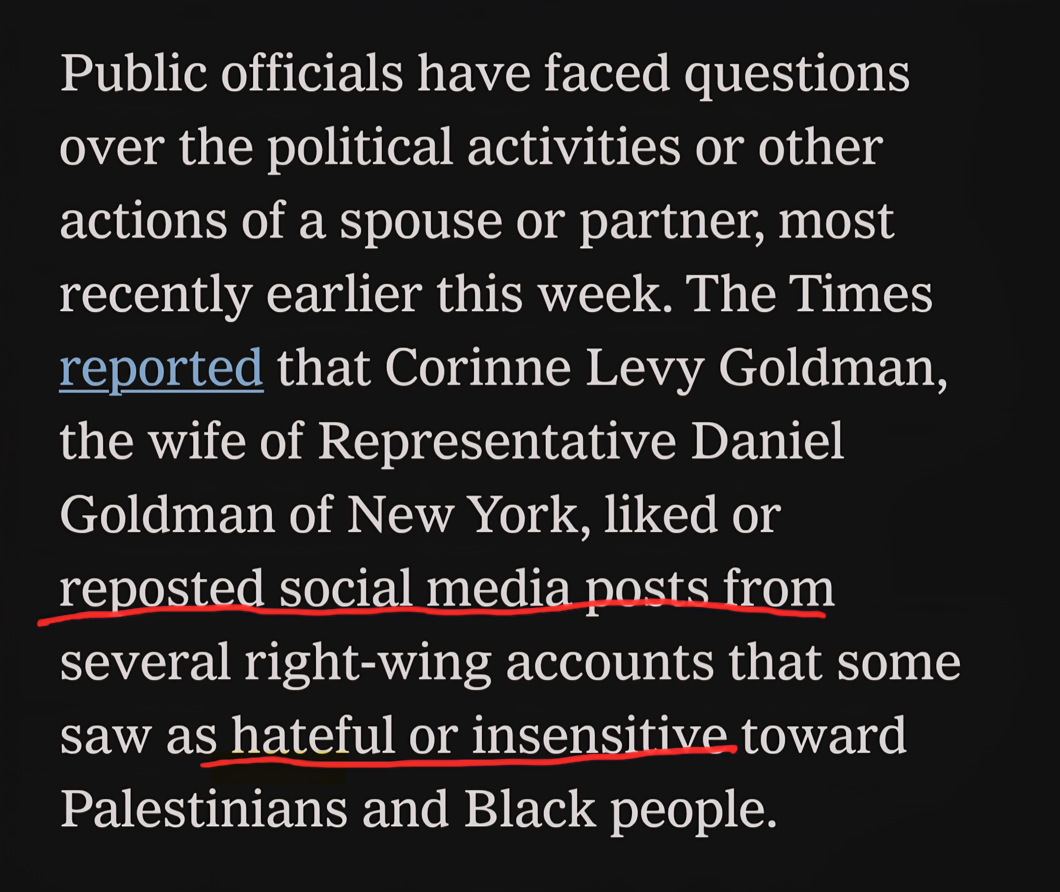 The Times raises concerns about a Jewish congressman from New York because his wife had “liked or reposted” posts from right wing accounts that some people considered hateful or insensitive.