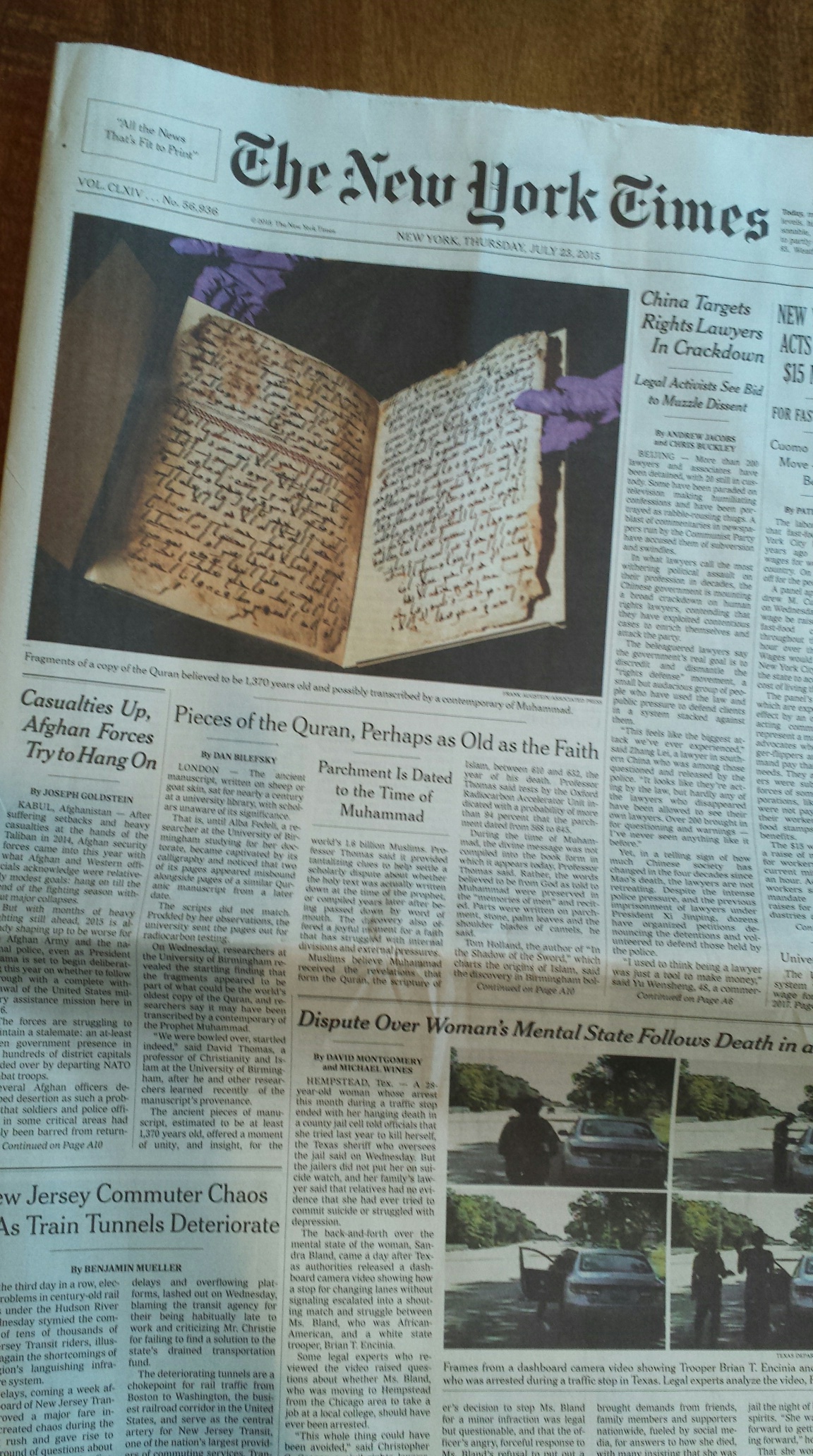 On a front page story with a large accompanying color picture, the New York Times relayed an incredible discovery: an old Quran that had been sitting on the shelves of the University of Birmingham, England for a century, was dated to around the year 600CE plus or minus 50 years.  That would make this version of the Quran the oldest manuscript in Islam.