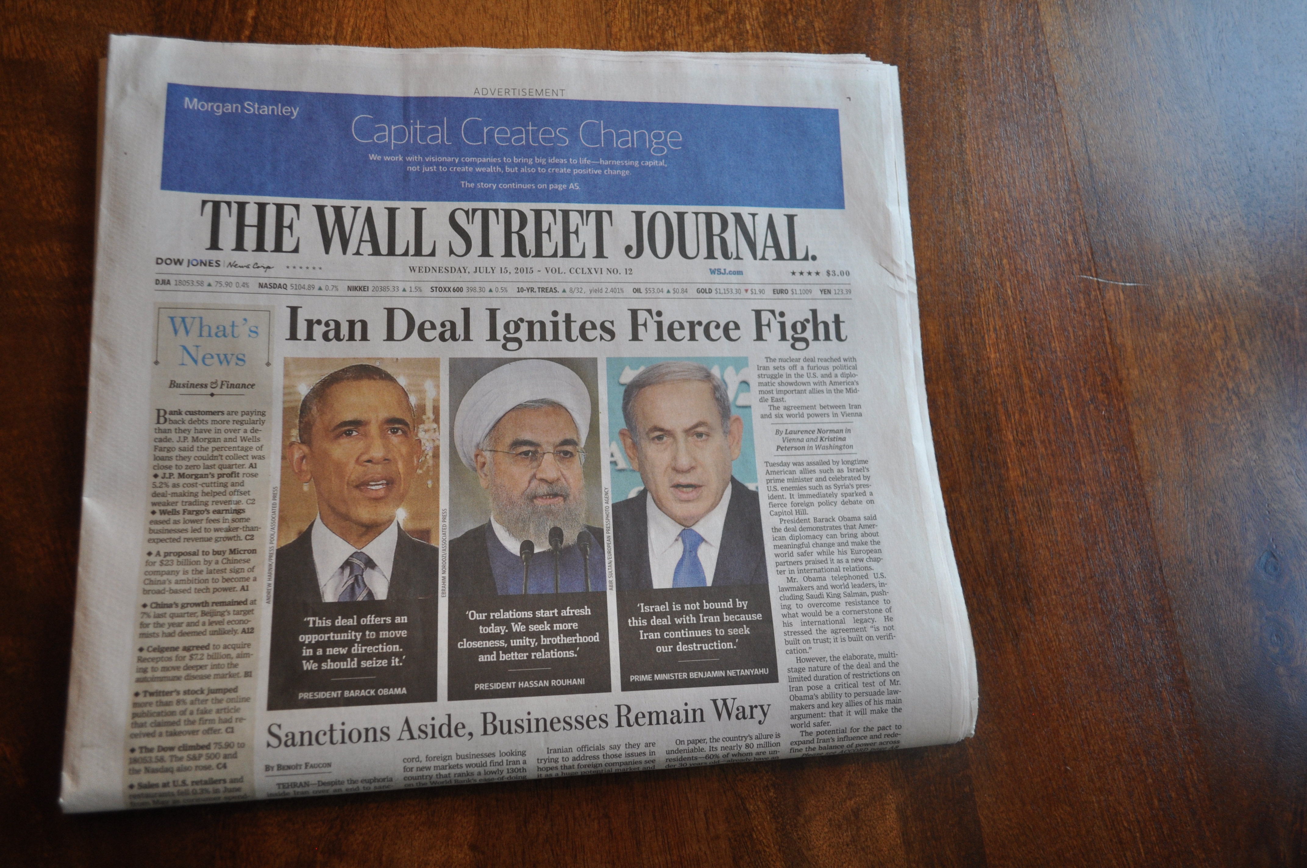 The WSJ also led with a factual headline about the reactions to the Iranian deal. “Iran Deal Ignites Fierce Fight” The paper included three large pictures with quotes from the leaders of the United States, Iran and Israel with their views on the deal terms.