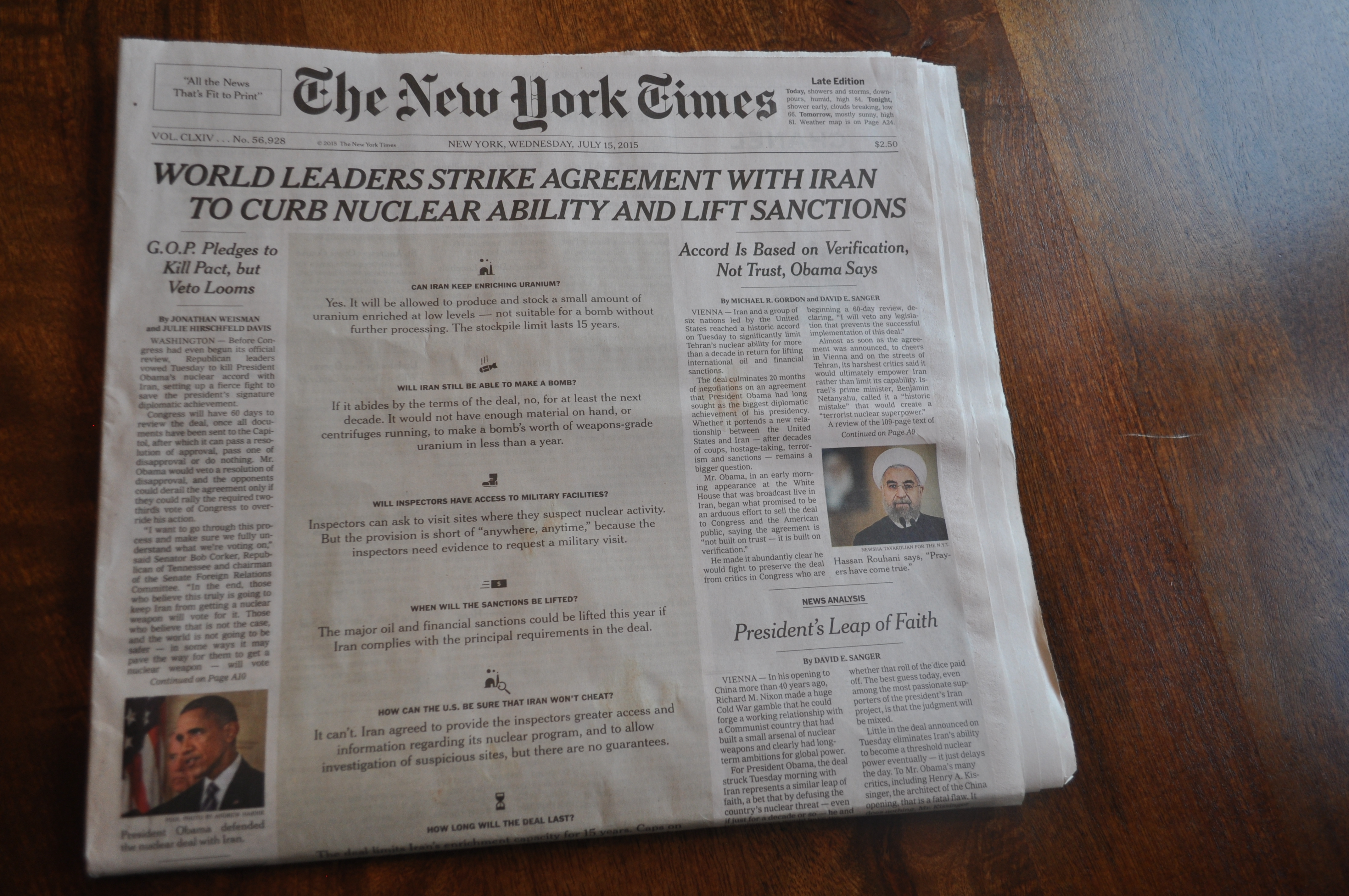 The headline for the NYT read: “World Leaders Strike Agreement with Iran to Curb Nuclear Ability and Lift Sanctions.”  Sub-headers read “Accord is Based on Verification, Not Trust, Obama Says” and “G.O.P. Pledges to Kill Pact, But Veto Looms.”  An article further down the page was entitled “President’s Leap of Faith“.