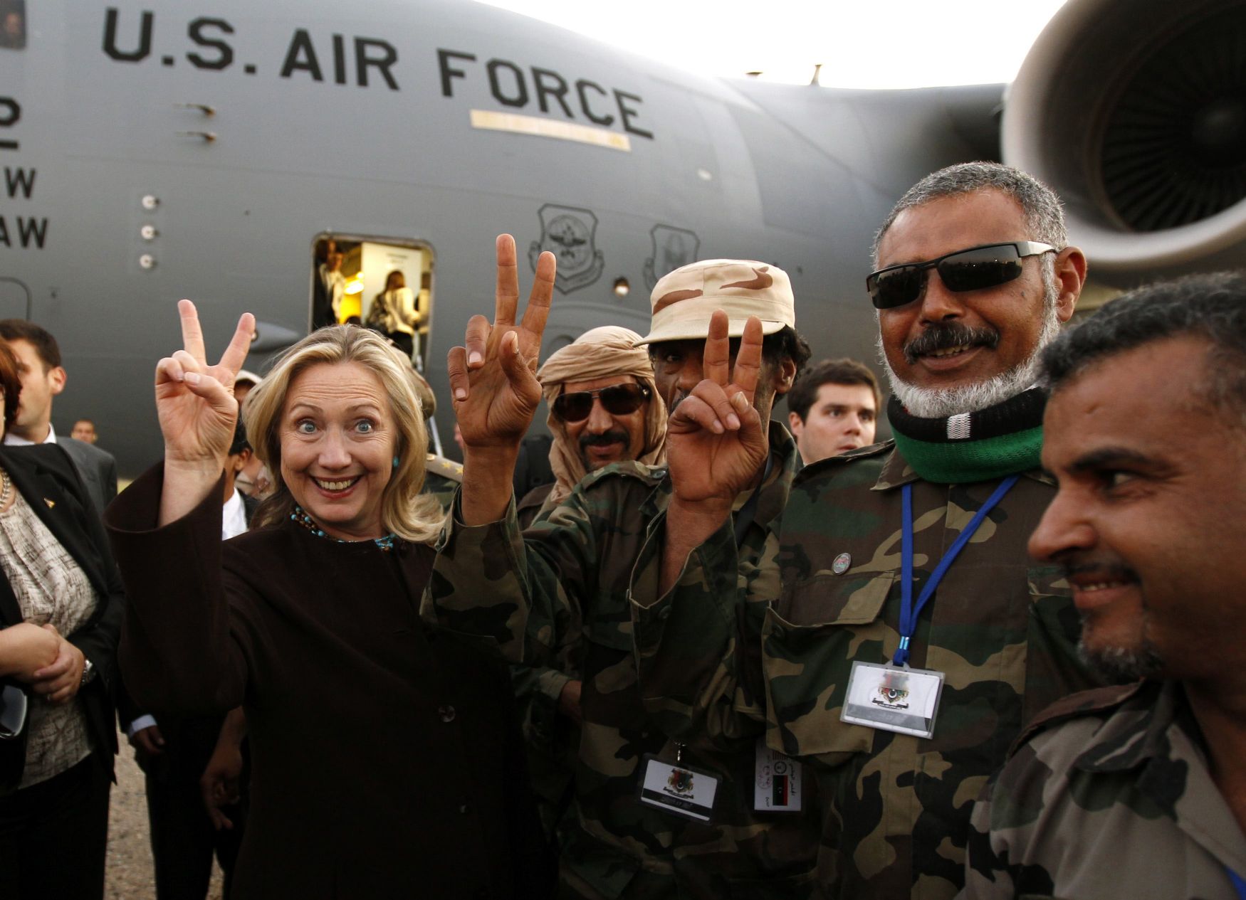 Secretary of State Hillary Clinton with Libyan soldiers declaring victory,