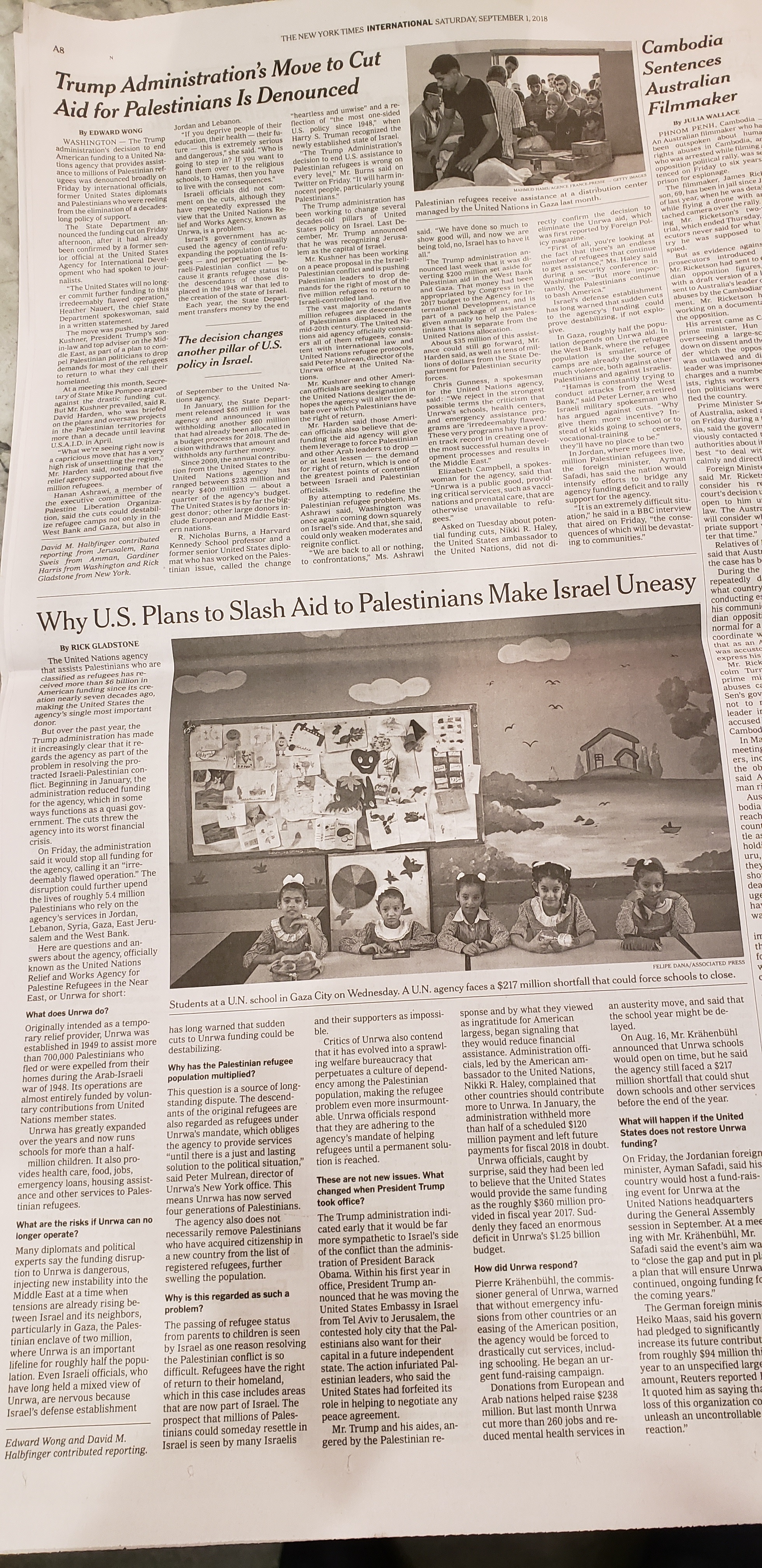 On September 1, 2018, the “news”paper ran two stories on the subject, conceivably showing two sides of the UNRWA defunding issue. One article was called “Trump Administration’s Move to Cut Aid to Palestinians Is Denounced.” The article included a picture of Arabs on line for aid with a caption “Palestinian refugees receive assistance at a distribution center managed by the United Nations in Gaza last month.” The second article was titled “Why U.S. Plans to Slash Aid to Palestinians Make Israel Uneasy.” It included a very large picture of five cute girls sitting at school desks with a caption “Students at a U.N. school in Gaza City on Wednesday. A U.N. agency faces a $217 million shortfall that could force schools to close.”
