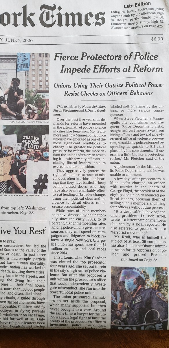 On June 7, 2020, a front page article led with a sub-title “Unions Using Their Outsize Political Power to Resist Checks on Officers’ Behavior.” The article continued: