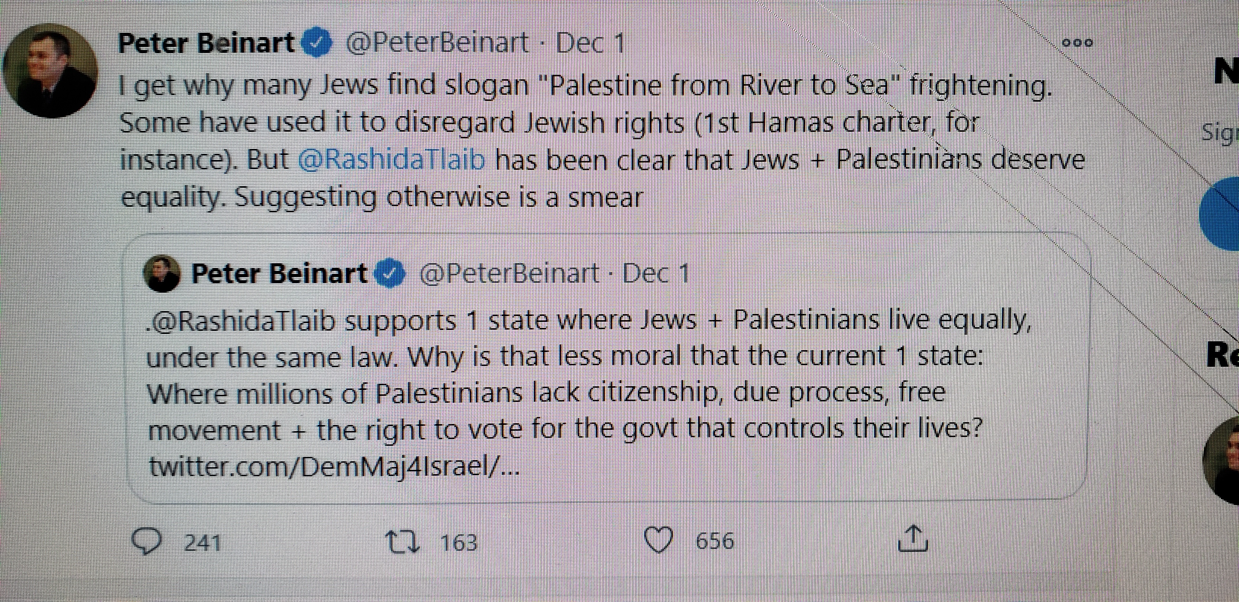 In attempting to defend Rep. Rashida Tlaib (D-MI) of the accusation that she promotes the destruction of Israel when she says “From the River to the Sea, Palestine will be free,” Beinart offered the following: