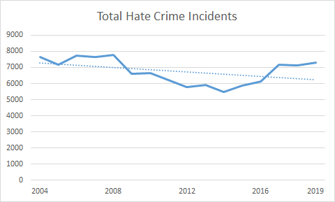 The overall trend in hate crimes was declining but began to uptick in 2015 due to a 23% spike in anti-religion attacks. The numbers spiked again in 2017 with year-on-year increases of 18%, 23% and 23% for race, ethnicity and religion-based hate crimes, respectively. It is the only year when three different categories had double-digit increases in attacks.