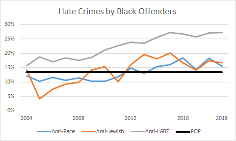 (note: in 2019, there were 2,314 attacks against Black people while there were 995 against Jews and 867 against gay men. There was another 752 against others in the LGBT+ community. An average Jew and LGBT person is much more likely to be attacked in a hate crime than an average Black person.)