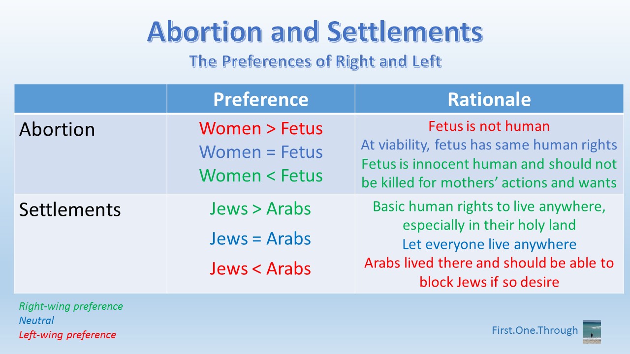 The right-wing has similarly taken the inverted path on Jewish homes in Judea and Samaria. They stand fully behind the rights of Jews to live where they want, especially in the Jewish holy land. The fact that Palestinian Arabs don’t like it is irrelevant. The impacted party must learn to live with the actions of people who use their agency to control their lives.