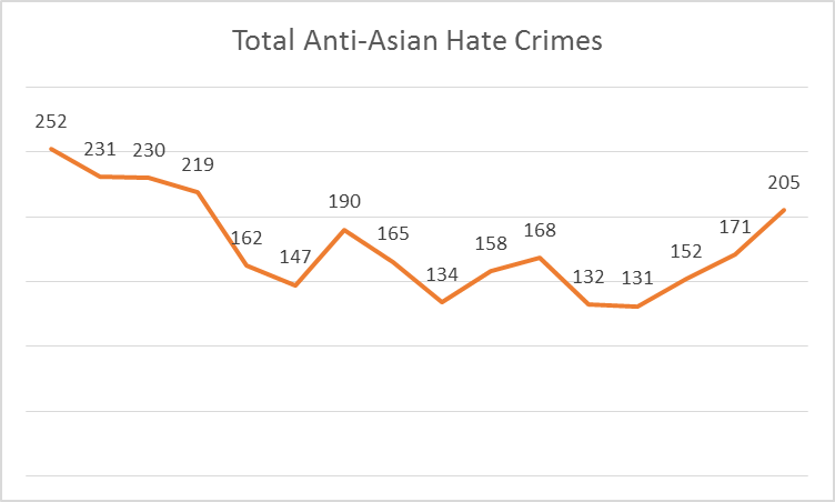 Crimes against Asians are not common compared to other minority groups but have been trending upwards after many years of decline. They bottomed out in 2015 and 2016 and have risen in every year since.