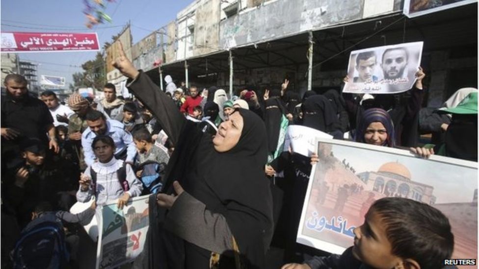 Palestinian Arabs holding the pictures of the two Arab terrorist who slaughtered Jews in a Jerusalem synagogue and throwing candies as they celebrated the murder of Jews, November 2014.