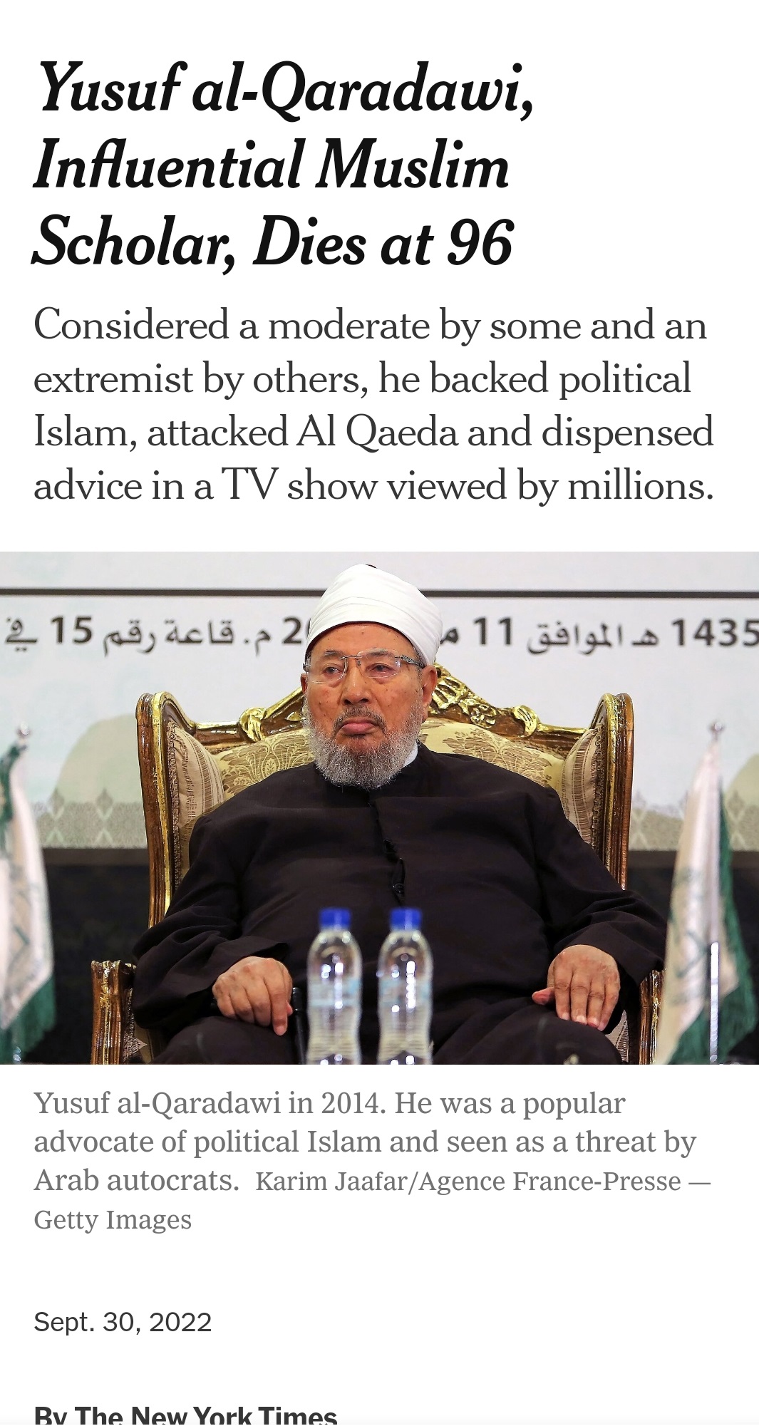 The New York Times decided to print the obituary of Yusuf al-Qaradawi, a fiery leader of the Muslim Brotherhood, an advocate for violence and vocal anti-Semite. The paper opted to use a balanced approach in covering his life saying some thought of him as “a moderate” while others considered him “an extremist.”