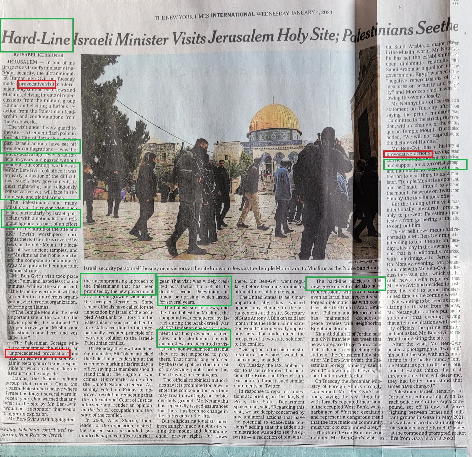 The article led off with a comment lifted from the Muslim Arab world that Itamar Ben-Gvir’s visit to the holy site was “provocative.” Kershner used the term three times (highlighted in red boxes above). The visit was nothing of the sort. The Temple Mount has standard visiting hours as it did when Ben-Gvir visited on Tuesday.