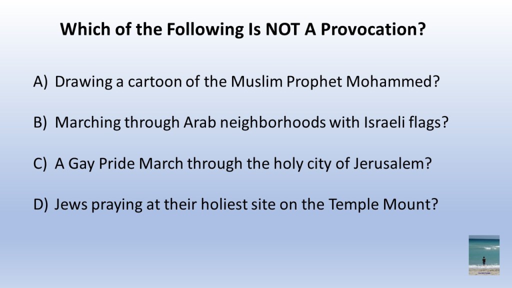 This is a complete inversion of victim and aggressor. A visit by a prominent Israeli Jew to the holiest site in Judaism during regular visiting hours was not the trigger for violence, any more than a woman who rejected an unwanted incel’s advance deserves to be attacked. Adding the clause that Israel’s government is politically and religiously right-wing while saying nothing about the Islamic terrorist groups further paints Israelis as instigators of violence.
