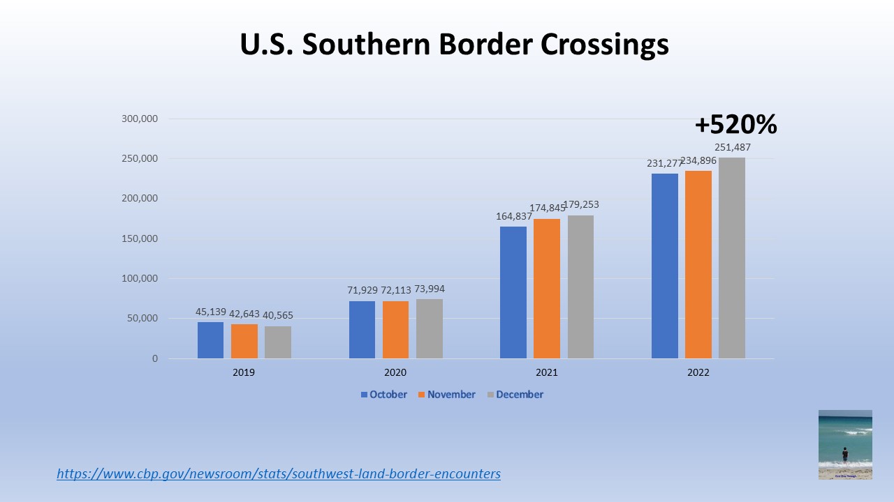 From December 2019 to December 2022, the number of land encounters with immigrants climbed OVER FIVE TIMES. Just in El Paso, from December 2021 to December 2022 the number of migrant encounters jumped 186%, as if the U.S. government has given up on the issue.