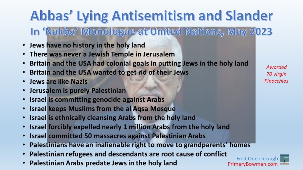 Acting President of the Palestinian Authority, Mahmoud Abbas, was lucky enough to be given a platform at the United Nations on May 15, 2023 to discuss the 75th anniversary of what Palestinians call the “Nakba,” the events surrounding the formation of Israel in which Arabs first rejected Jews being given any part of Palestine and then lost a war to destroy Israel. At war’s end, Israel denied admitting roughly 700,000 Palestinian Arabs who had left the fighting area while they waited for the Jewish State to be destroyed by five invading Arab armies. It was the first time that the United Nations held such event, and Abbas was given the floor to address the global body.