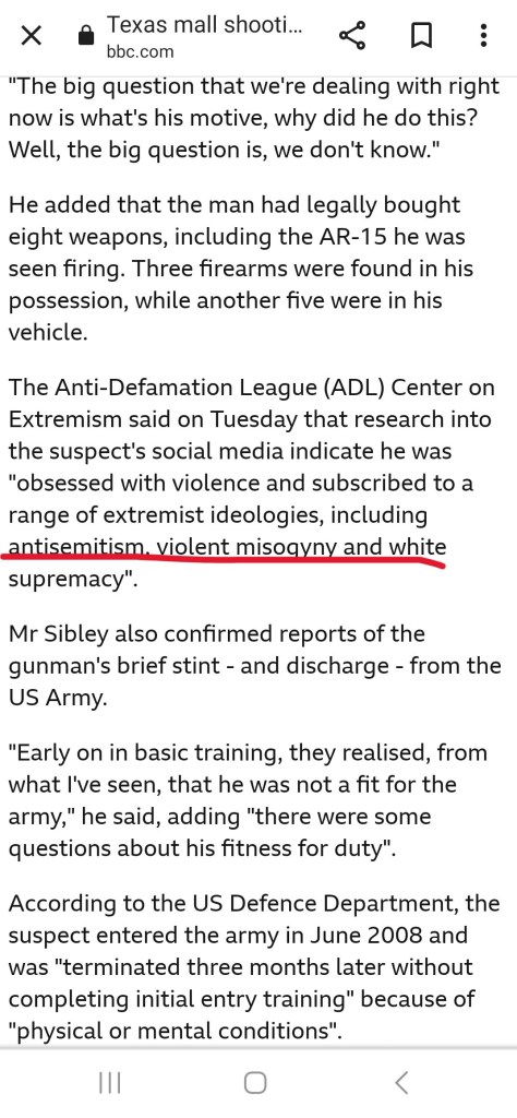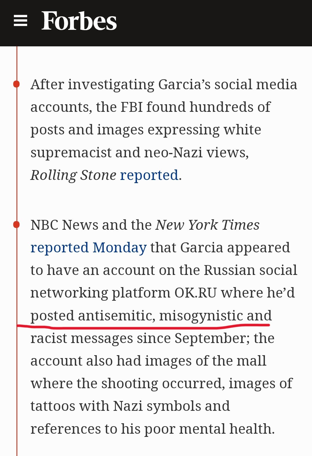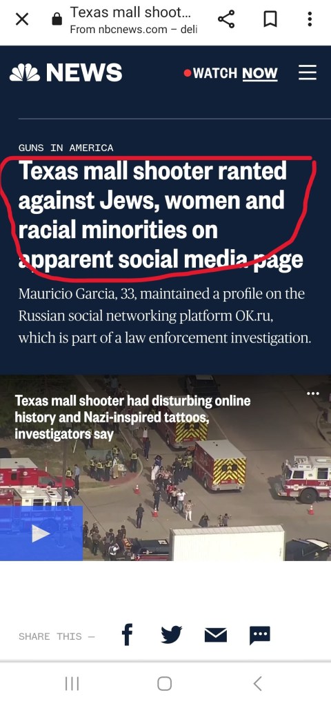 CNN said that Garcia had posts which “espoused antisemitism.” NBC News led with a headline that the “Texas mall shooter ranted against Jews, women and racial minorities.” The ADL also led its headline that “Shooter in Allen, Texas, Embraced Antisemitism, Misogyny and White Supremacy.” The BBC quoted from the ADL, and Forbes referenced NBCNews, both covering “antisemitism, misogyny and white supremacy.”