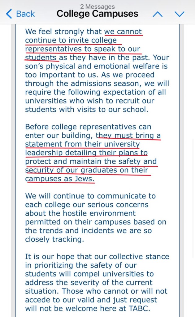 A letter was shared at a New Jersey Jewish high school which said it would no longer allow some universities to present on site unless they attest that the schools are safe.