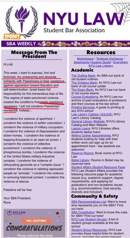 The head of NYU Law Student Bar Association sent out a broad email about “my unwavering and absolute solidarity with Palestinian in their resistance against oppression toward liberation and self-determination.” Ryna went on to say Israel’s blockade of the terrorist enclave “made resistance necessary. I will not condemn resistance.” That such a person can be a lawyer and approve of the wanton slaughter of non-combatants en masse is terrifying. This person, Ryna Workman, should be rejected from all employment.