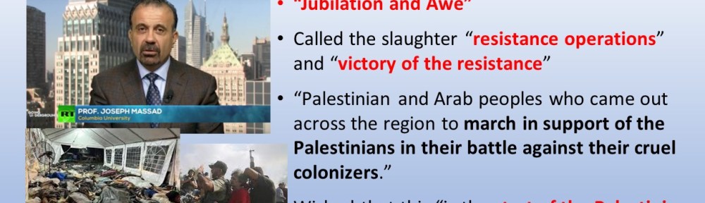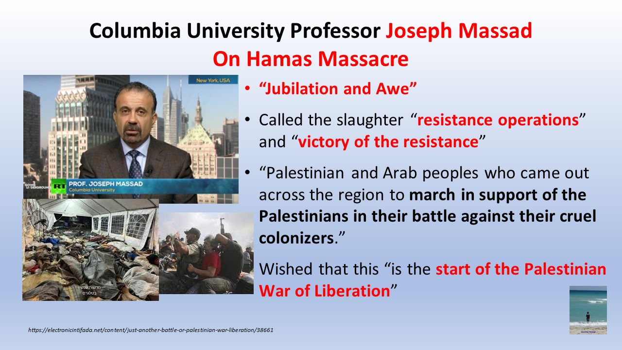 When Joseph Massad of Columbia University wrote about the “start of the Palestinian War of Liberation,” he did not see Arab terrorists hacking children to death and killing the elderly; he saw freedom fighters throwing off the yolk of oppression of Jewish invaders as a moment of “jubilation and awe.”