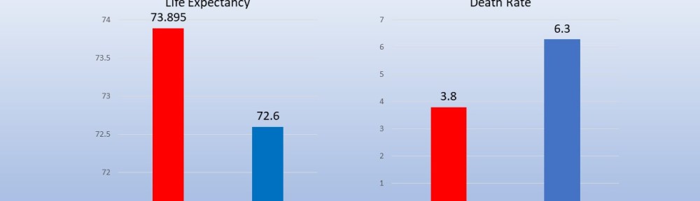 The average life expectancy in Gaza is 74 years, about 1.5 years longer than in Egypt. There are roughly 2.5 fewer deaths per 1,000 people in Gaza than in Egypt, with death rates of 3.8 and 6.3, respectively.