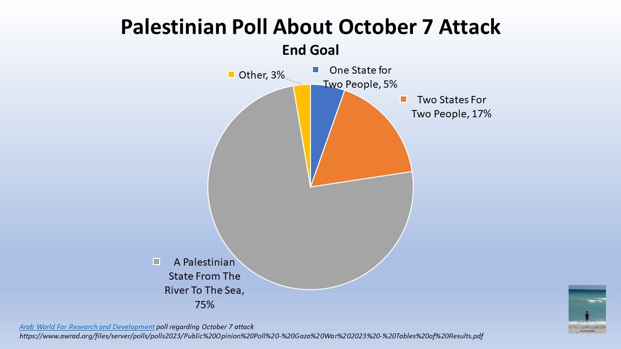 A Palestinian poll about the October 7 Hamas massacre was conducted by the Arab World For Research and Development. It shows Palestinians overwhelming supporting the attack as a war to end the Jewish State and control of the Temple Mount.