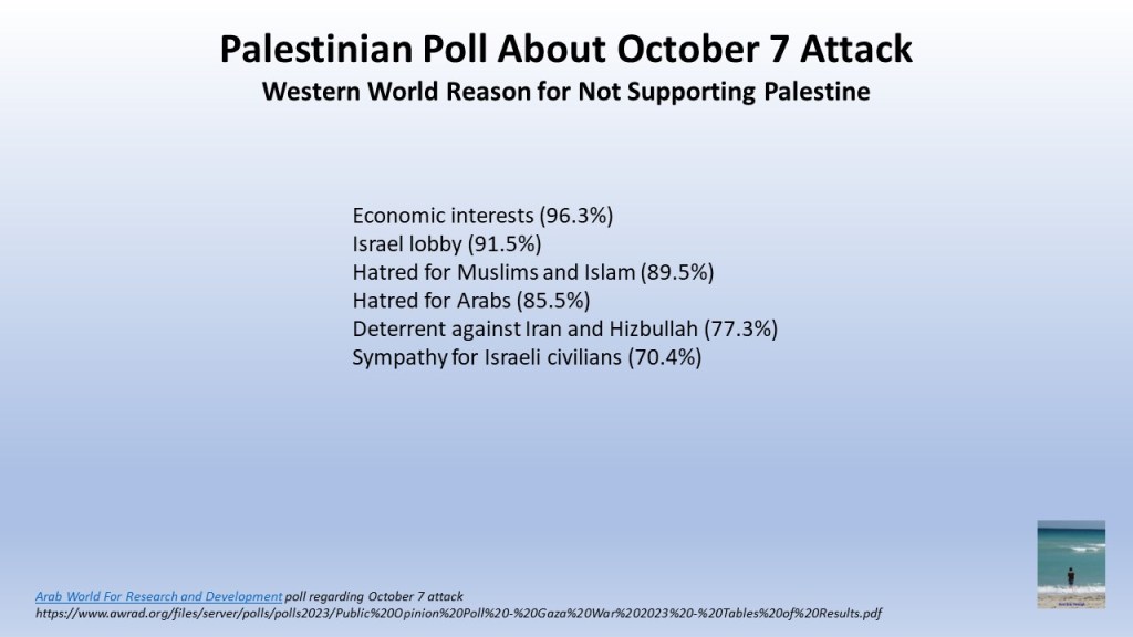 While Palestinian Arabs seem to have greater conviction in the possibility of liberating all of historic Palestine and supporting the fighters who are working to make that a reality, the “Free Palestine” opinion came in second at 29% in polling regarding the reasons for the Hamas attack. The leading belief was to stop the “violation” of the Al Aqsa Mosque in Jerusalem (35% of respondents). That may be because Hamas named the fight the ‘Al Aqsa Flood.’ Hamas and the Palestinian Authority have been falsely claiming for months that Jews are “storming al Aqsa” in “provocations” by simply walking around the compound during normal visiting hours.