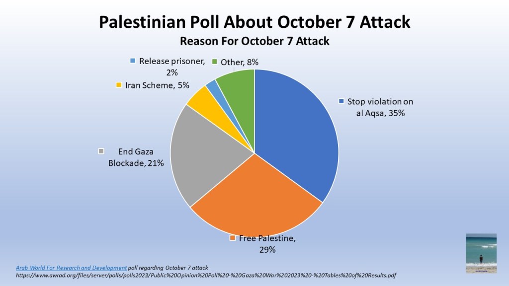 Hamas called this war the “al Aqsa Flood,” referencing Islam’s holy mosque in Jerusalem, far from Gaza. Palestinian Arabs believe that stopping Jews from visiting the Jewish Temple Mount is the main reason for the war – followed vey closely be retaking all of “historical Palestine.”