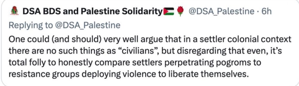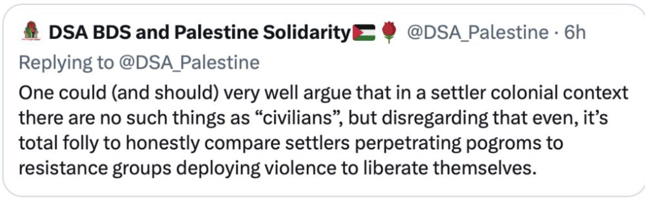In June 2023, the DSA Tweeted that no Israeli Jews should be viewed as civilians, that all are fair game to be targeted for violence, and simultaneously granted full absolution to Palestinians violently attacking Israeli Jews.