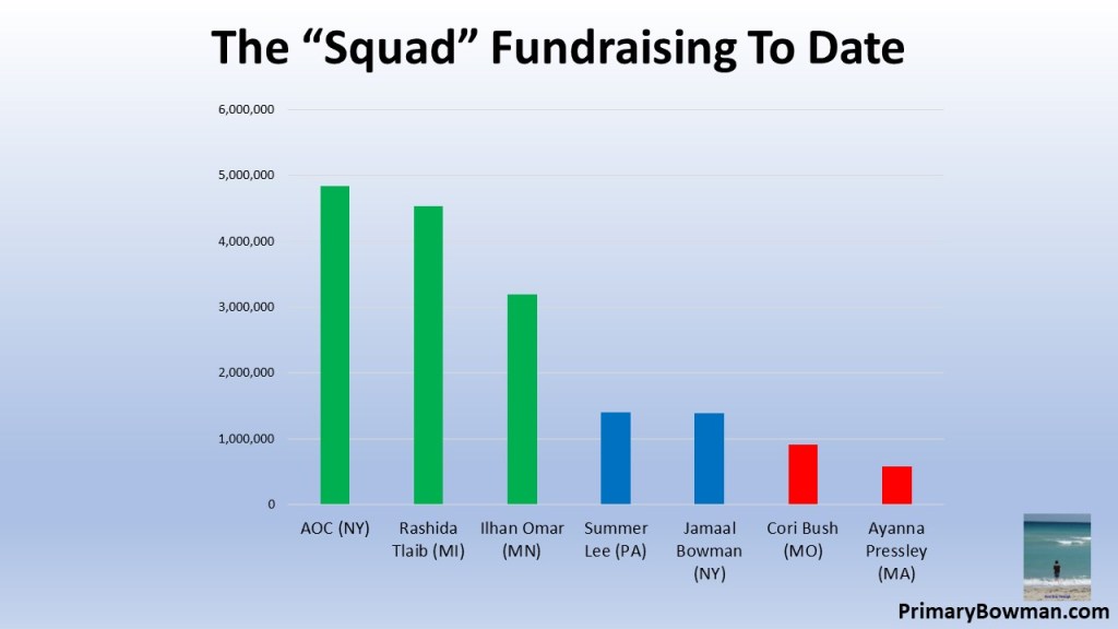 It is interesting to look at the overall fundraising for the candidates as well. AOC continues to be the major fundraiser as she’s been for years. However, this year, Rashida Tlaib and Ilhan Omar are close behind, likely because of Democrats funding the two Muslim members of congress who are upset about the destruction in Gaza (rather than disgust for Hamas). Cori Bush and Ayanna Pressley have barely been able to raise any money.