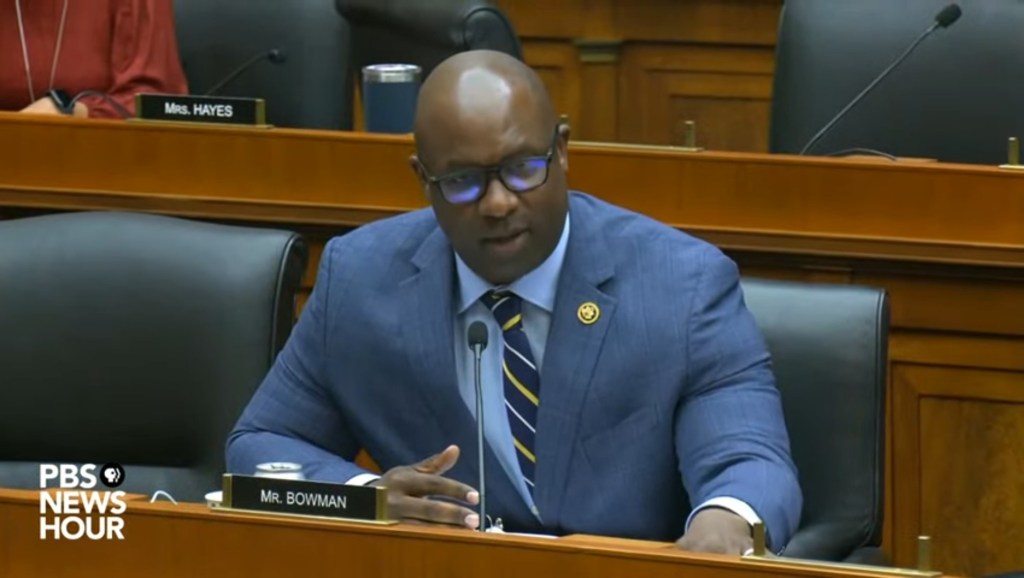 Bowman spoke after a short recess and his remarks can be seen in the video at 2:23:22. He asked three questions of the panel, starting with Columbia’s president Minouche Shafik, none of which related to the terrible situation of Jews being targeted on college campuses. The first question asked whether all discussions regarding the Gaza War were necessarily antisemitic. The second was asking about Islamophobia on campus. The last was whether there was action taken for a “chemical attack” against pro-Palestinian person on campus.