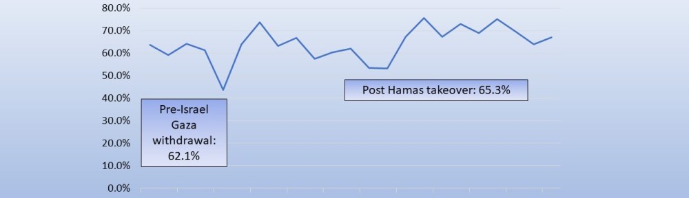Gazans are deeply supportive of Hamas and their wars against the Jewish State. Palestinians elected Hamas to 58% of the Palestinian parliament in 2006. In polls since 2007, a majority of 65% of Gazans support killing Israeli civilians. Hundreds of regular Gazans participated in the October 7 slaughter and a post-October 7 Massacre poll of Gazans showed 64% supported the attack and 60% support Hamas.