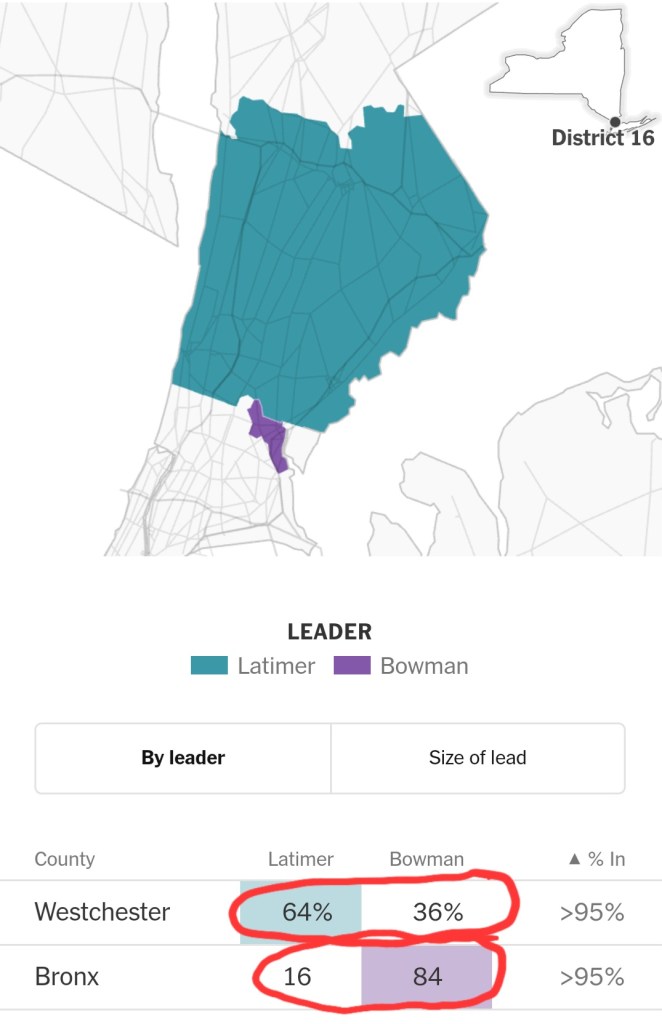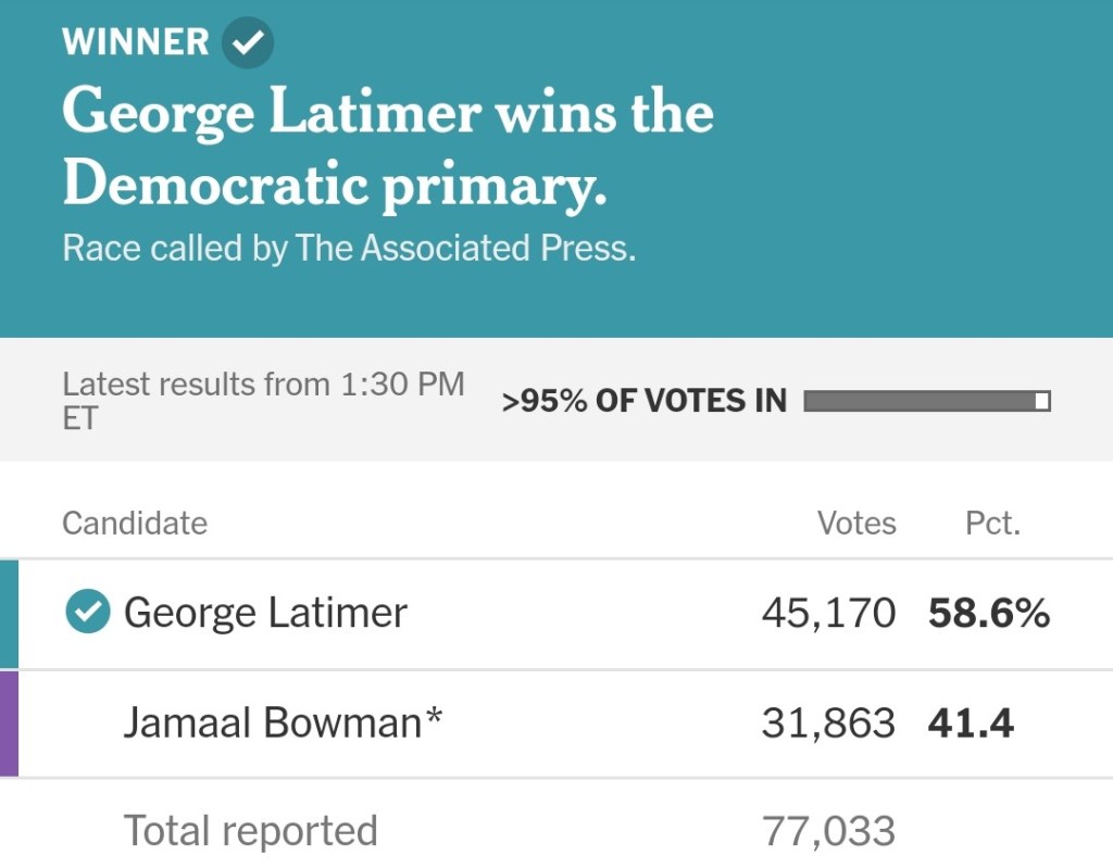 Latimer won the primary with about a 17 point spread, or 13,300 votes, on the strength of his turnout in Westchester where he secured 64% of the votes. Bowman did well in Co-op City, but with a relatively small number of voters.
