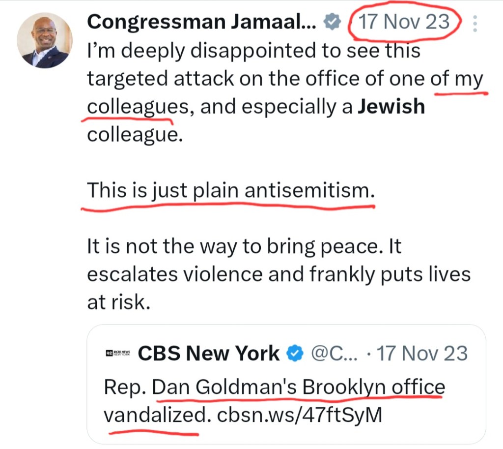 Consider when antisemitic graffiti was painted on Jewish stores in Scarsdale, NY in January 2024. Bowman did not show up to address the Jewish crowd even though Latimer did. It is not as though Bowman didn’t think “Genocide supporters” painted on Jewish stores wasn’t antisemitic; he condemned such graffiti when it was painted on fellow Democratic congressman Dan Goldman’s office in November 2023.