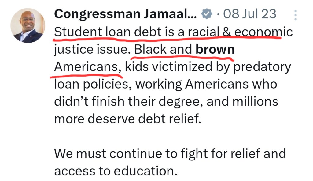 When Bowman discussed student debt, he didn’t discuss it for all his constituents but focused on the Black and Brown communities. Repeatedly.