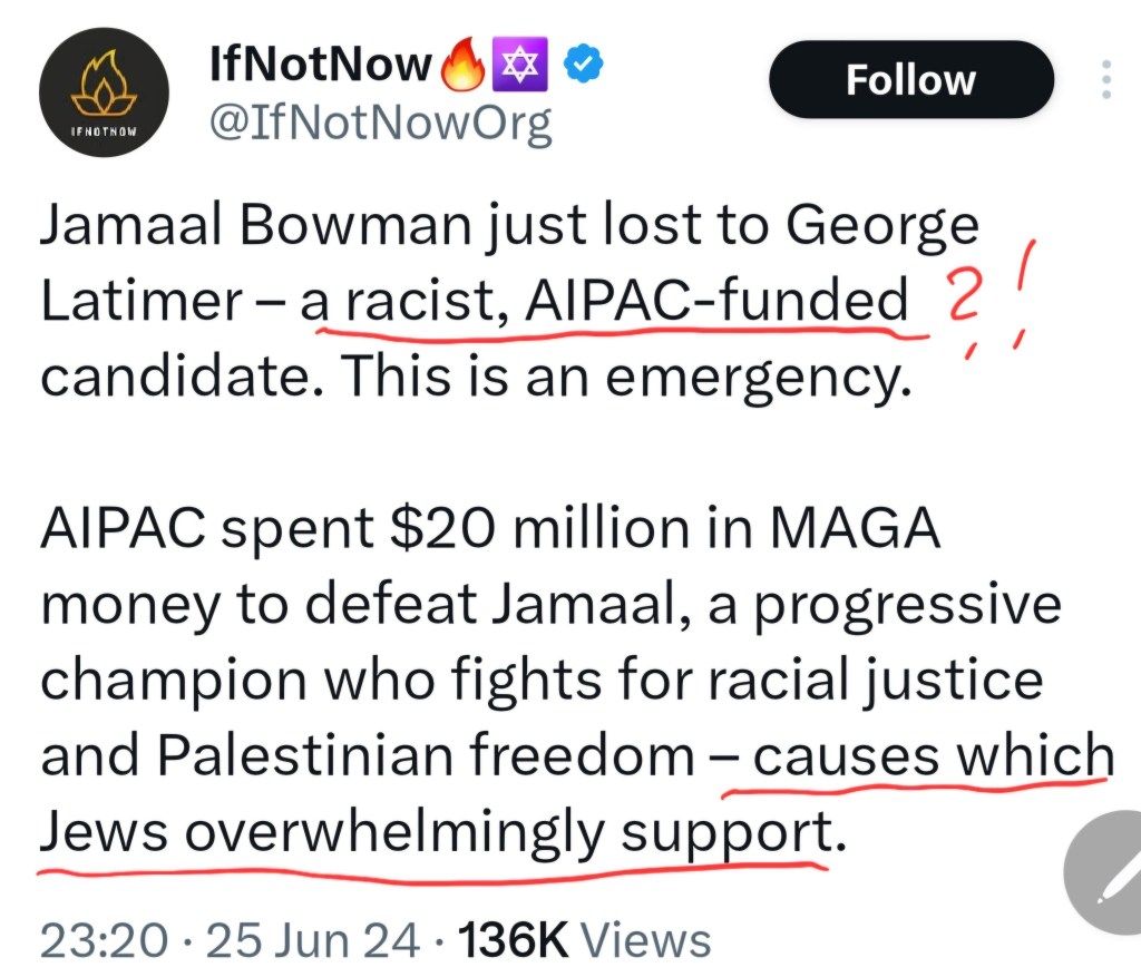 Bowman loved the narrative, and used antisemitic language that AIPAC was “dark money” and were a bunch of “baby killers” in lines lifted from medieval blood libels (see concession speech 3:00 as an example).