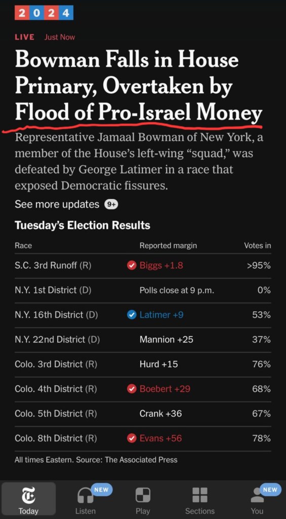 So when the polls closed on June 25, and the obvious became public, The New York Times didn’t talk about the censured eak politician who never got to know his constituents, and instead blamed Bowman’s demise on a “flood of pro-Israel money.”