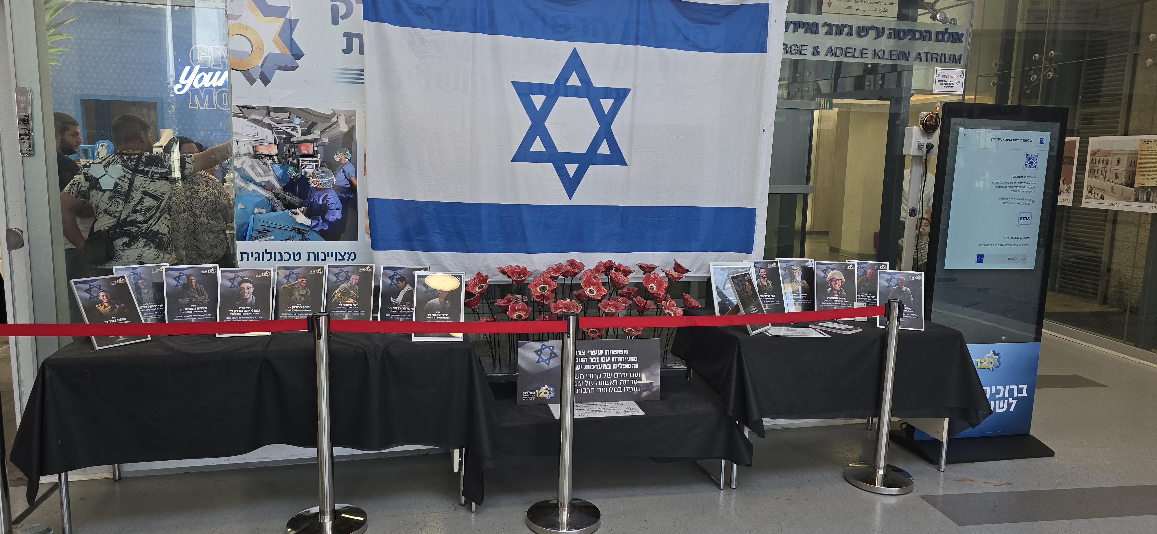 The hospital lobby has a long table filled with pictures of family members of hospital workers who were killed over the nine months of war. Some were killed during the October 7 massacre while others died in the fighting to free the hostages and to bring the terrorists to justice.