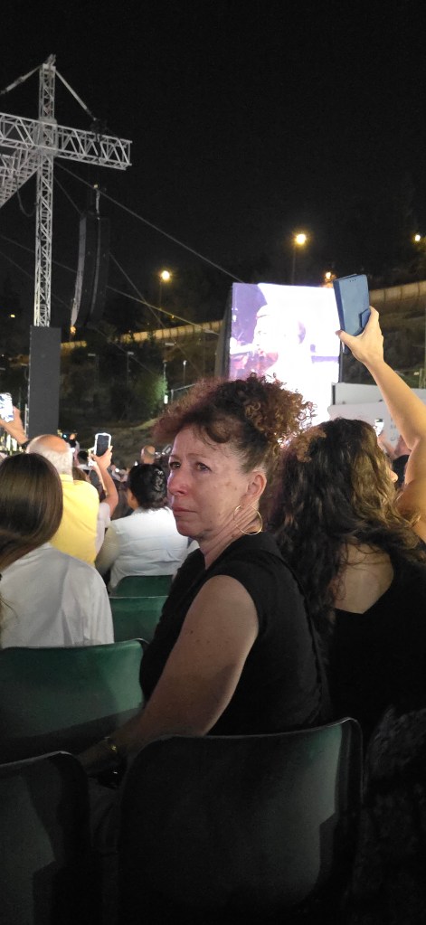 Woman crying over fate of the murdered, the fallen and the hostages while she surveyed her fellow countrymen raising their arms at a Hanan Ben Ari concert, that they have suffered deeply in the 2023-4 Hamas war.