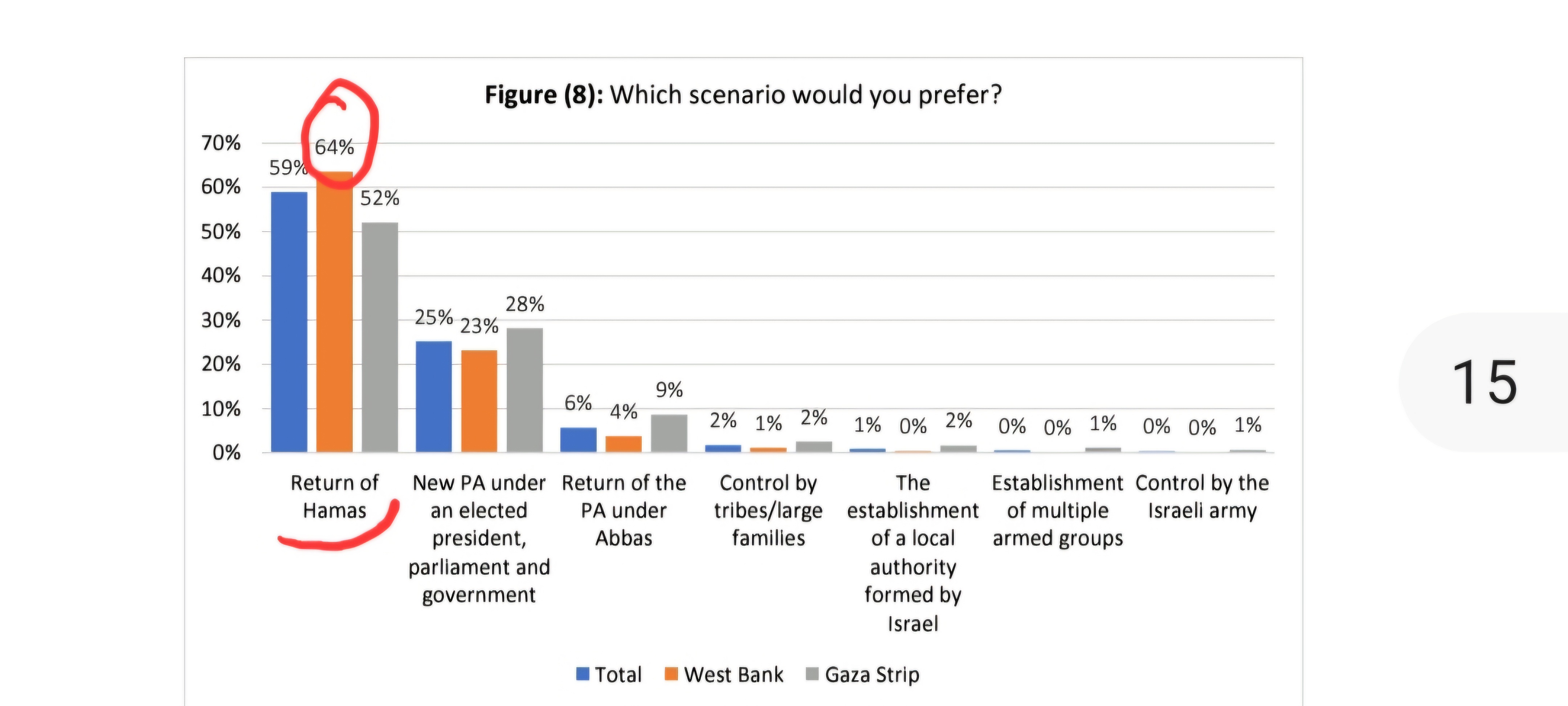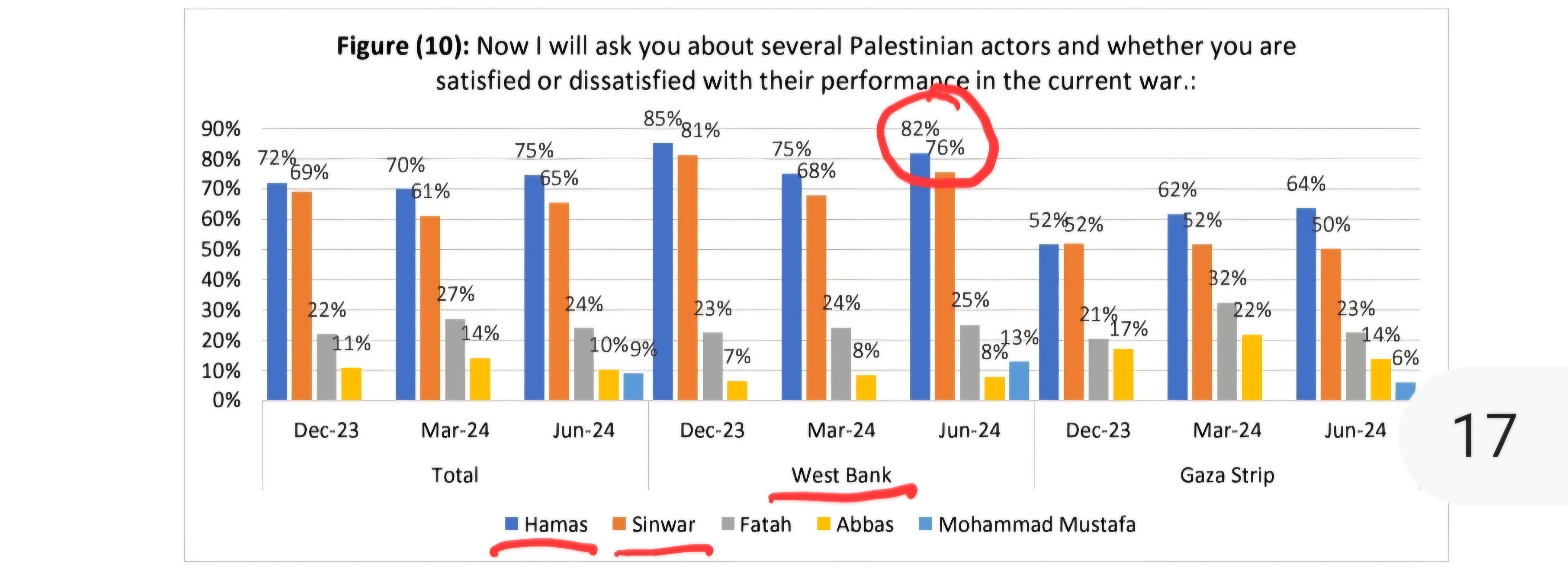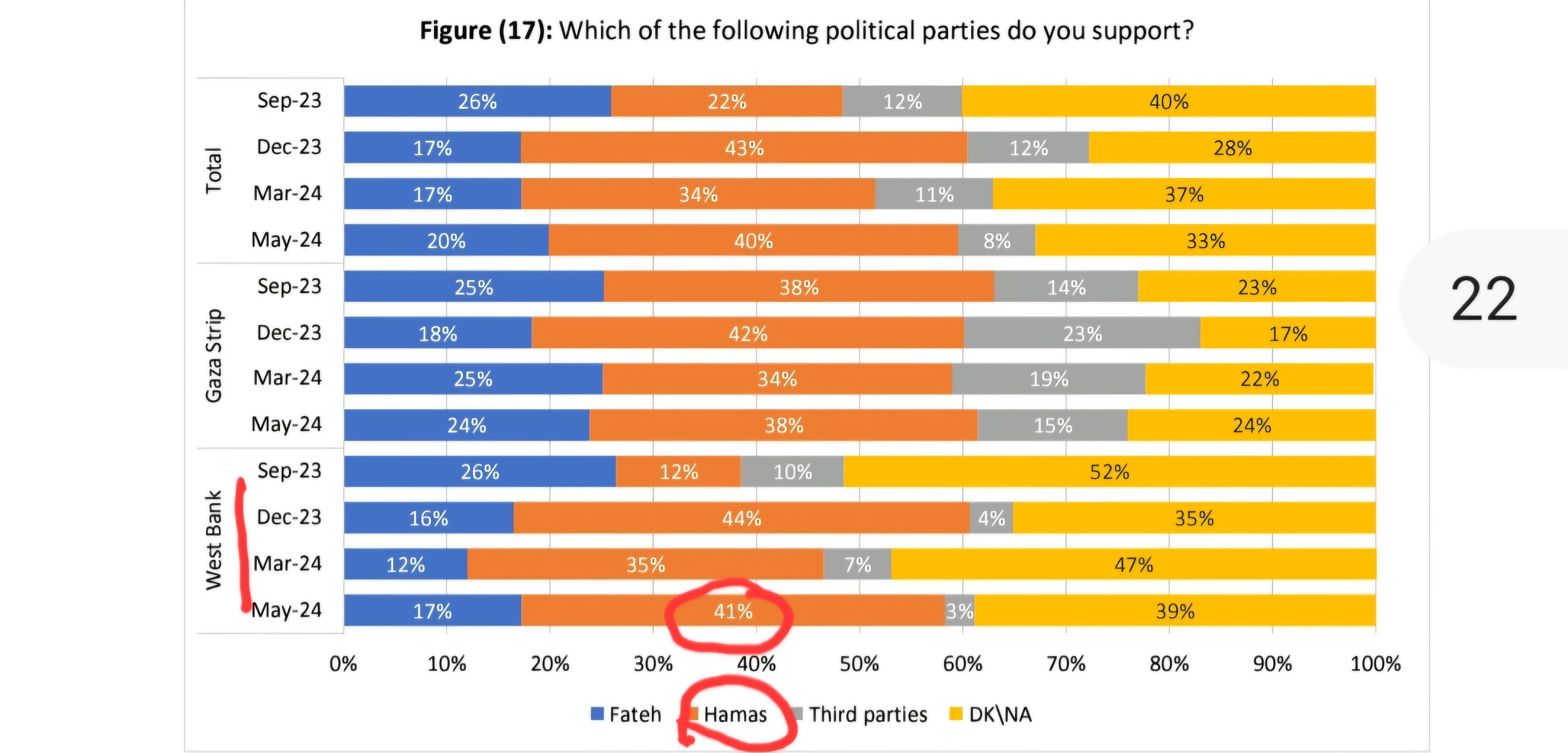 Asked in a variety of formats, West Bank Arabs support Hamas (82%) and the architect of the October 7 atrocities, Yahya Sinwar (76%) significantly more than Gazans (64% and 50%, respectively). A majority of 71% of West Bank Arabs want Hamas to rule Gaza compared to 45% of Gazans. West Bank Arabs prefer Hamas over the less genocidal Fatah (41% to 17%), higher than the margin among Gazans (38% to 24%).
