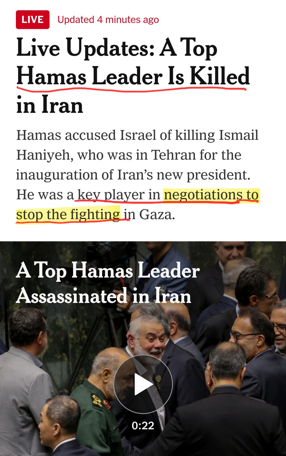 Over a picture of a smiling Haniyeh amongst friends, the Times wrote that this leader “was a key player in negotiations to stop the fighting in Gaza,” cementing the notion that Israel killed a man of peace.