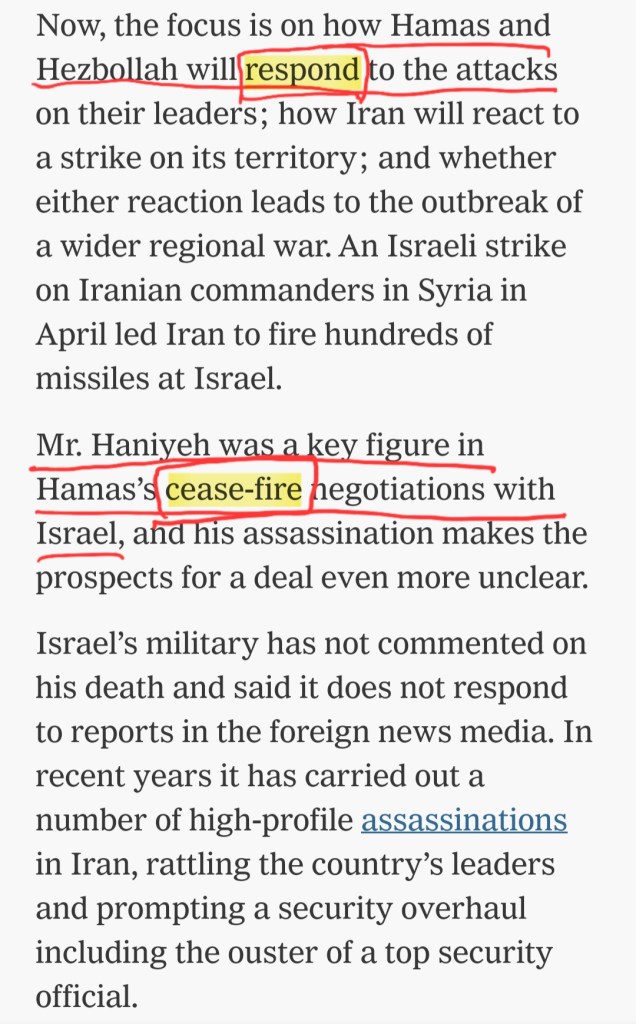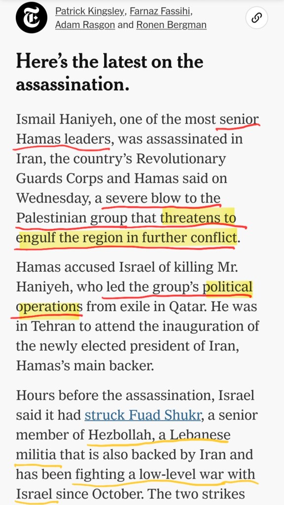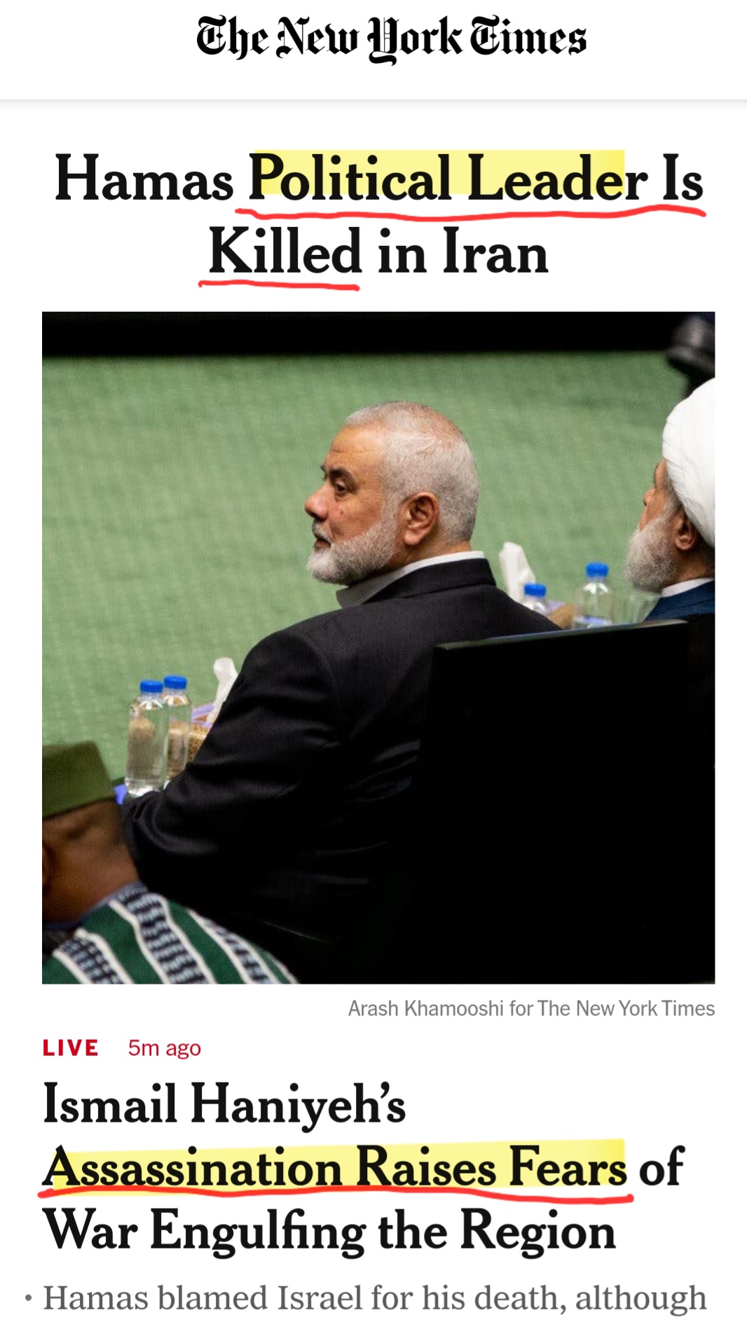 The Times led that Haniyeh was a “political leader” as if his hands were clean. His “assassination raises fears of war,” rather than the killing of a leading terrorist bringing justice to a region that has only known war.