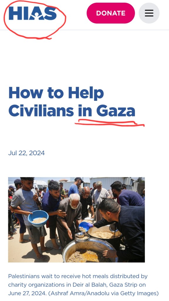 On July 22, 2024, HIAS broadcast a note to its mailing list and on its website “How to help civilians in Gaza.” It specifically highlighted that “in the aftermath of the attacks on October 7, the humanitarian conditions in Gaza quickly became extreme, and the humanitarian crisis there continues to worsen by the day,” without mentioning that the October 7 massacre was launched from Gaza with the broad support of Gazans.