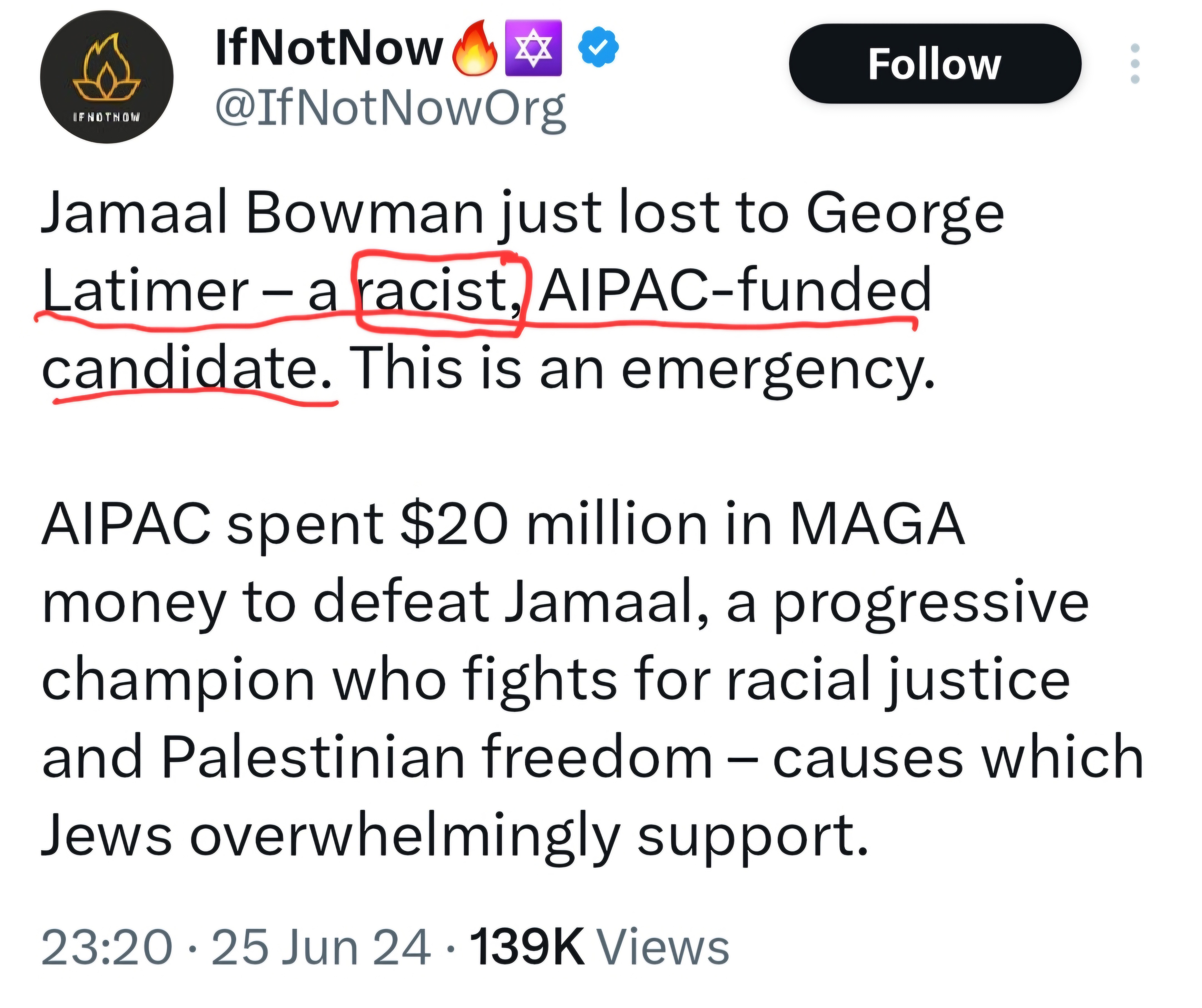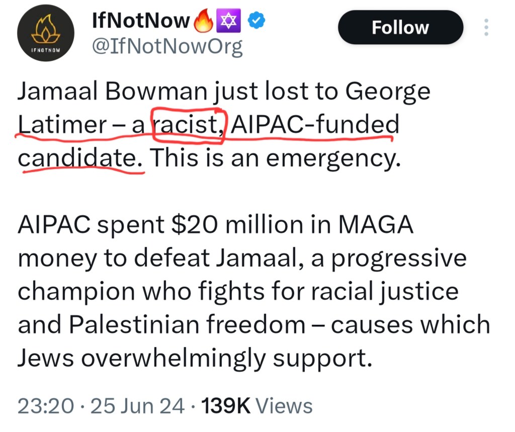 INN has aligned itself with groups like Justice Democrats and Democratic Socialists of America in trying to elect anti-Zionist people of color like Rep. Cori Bush and Rep. Jamaal Bowman. They have signed onto the “Reject AIPAC” tagline and smeared white progressive politicians like George Latimer “a racist,” because he’s a white man taking a black man’s job.