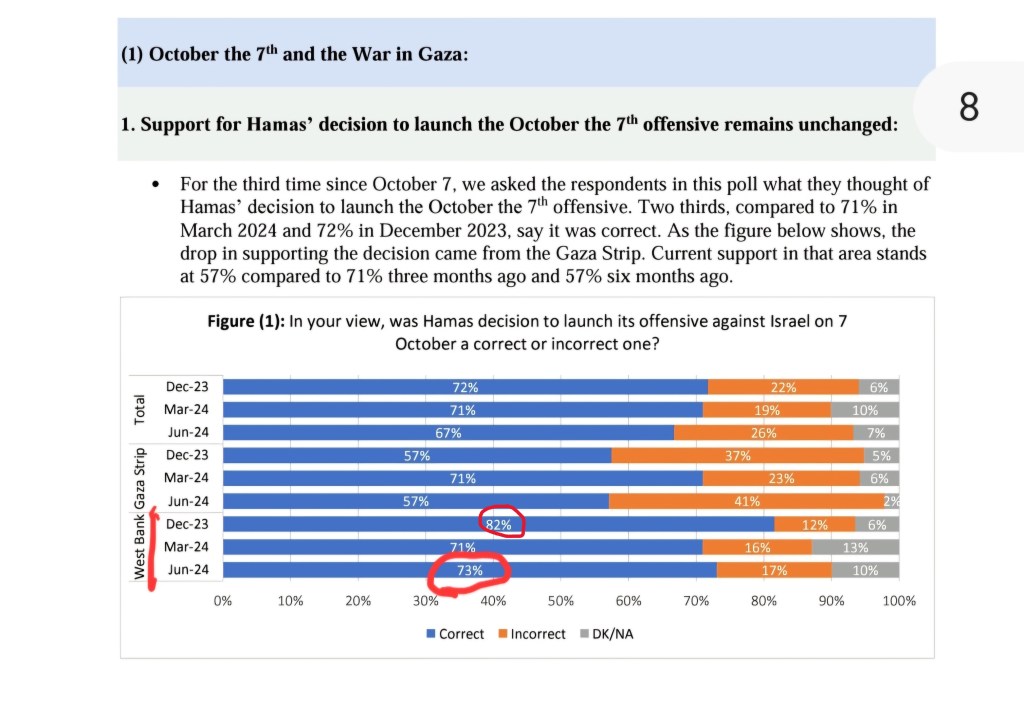 According to a June poll conducted by the PCPSR, West Bank Arabs immediate reaction to the butchering of Israelis was overwhelming glee. In a December 2023 poll, 82% of West Bank Arabs supported the heinous attack, far more than the 57% of Gazans. Support continued to remain high in June 2024, with 73% of West Bank Palestinians supporting October 7.