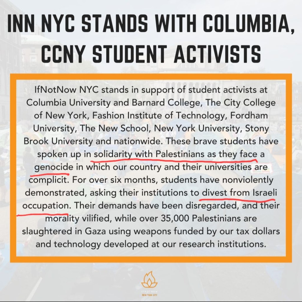 The anti-Zionist group was very active on college campuses during the 2023-4 school year promoting anti-Israel actions. Even at campuses which saw wild antisemitic activity like Columbia, Barnard, NYU and CCNY, INN was proud to stand in support of the anti-Israel activities.