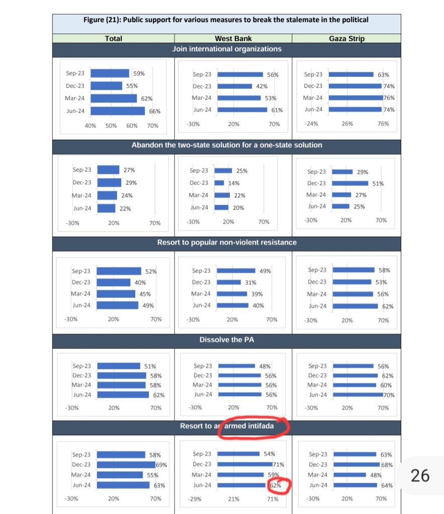 Consistent with West Bank Palestinians support for Hamas and the October 7 massacre is the preference for violence, with 62% expressing support for an “armed intifada.”