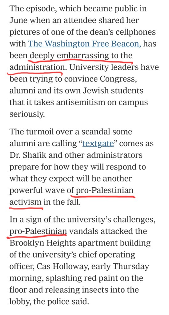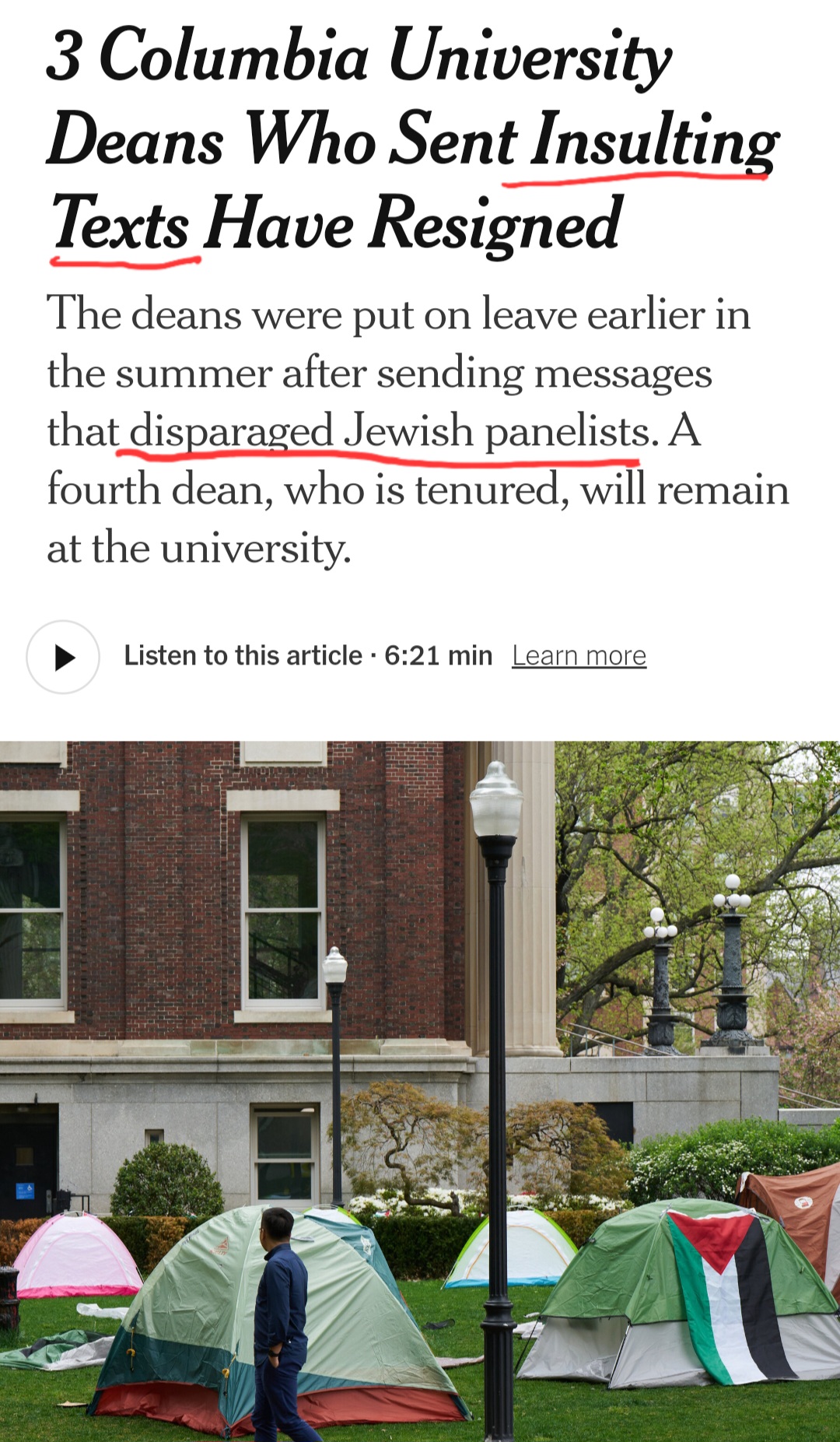 In the sub-header, the Times was more clear that the messages “disparaged Jewish panelists” but was silent on the fact that this was a panel of Jews specifically discussing antisemitism at the university. A casual reader could have concluded that maybe the deans posted something about a select number of Jews who happened to be discussing something generic. The deans didn’t just mock Jewish panelists but the entire notion that there is any antisemitism.