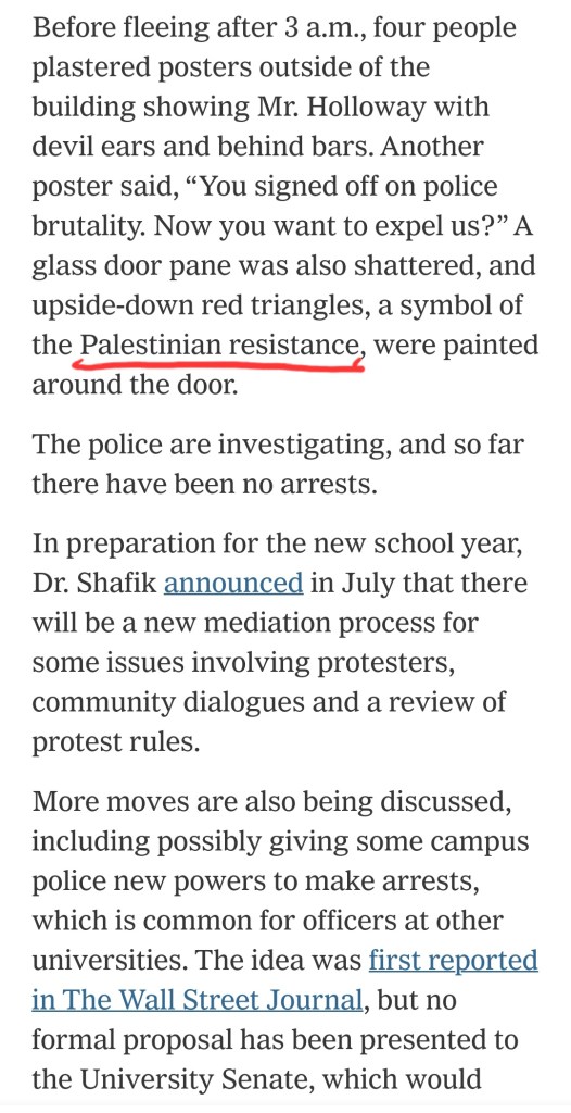 The notion that the current wave of antisemitism is just a “powerful wave of pro-Palestinian activism,” is a disgraceful whitewash by the Times of jihadi Jew-hatred manifest in the encampments. To label people who celebrate Hamas’ massive butchering of over one thousand people “a symbol of the Palestinian resistance” is to platform antisemitic propaganda.