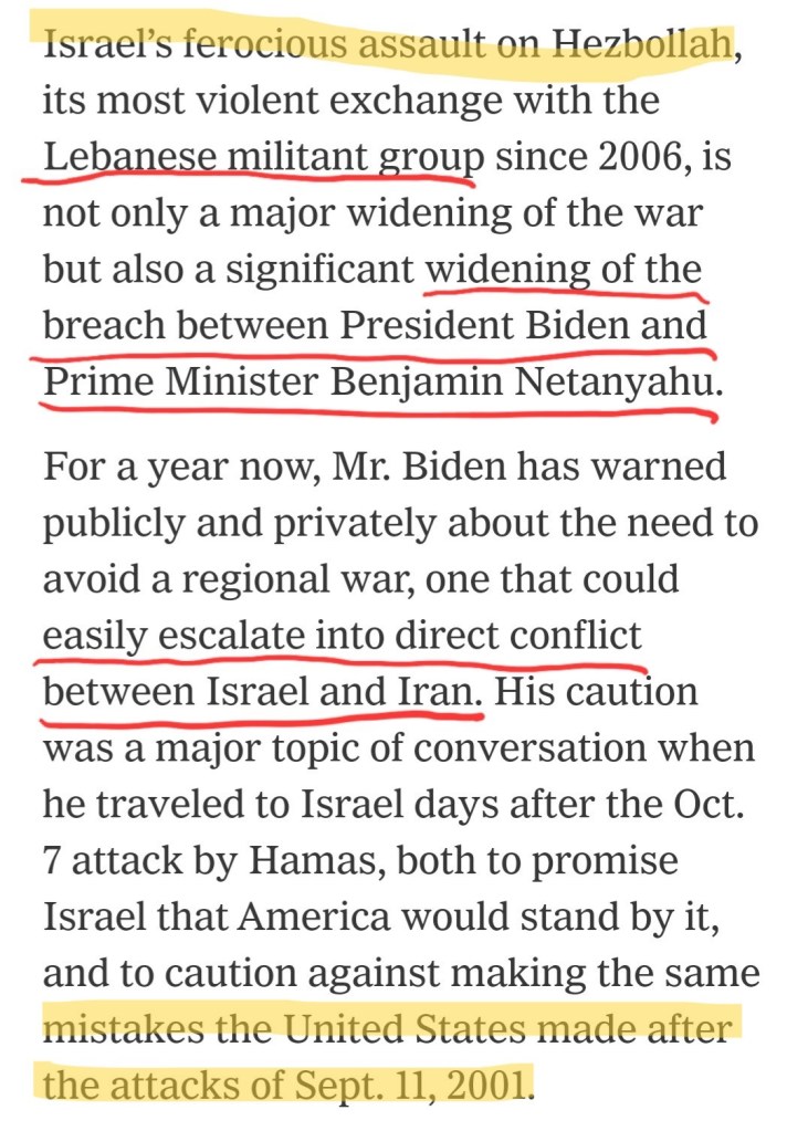 In this telling of the events, Israel has opened up a new front against Hezbollah for virtually no reason, as the key to stopping the Hezbollah attacks is to end the fighting in Gaza. Israel’s “ferocious assault on Hezbollah” is not only unwarranted but infuriating the United States President Biden who has sought to confine the fighting to Gaza.