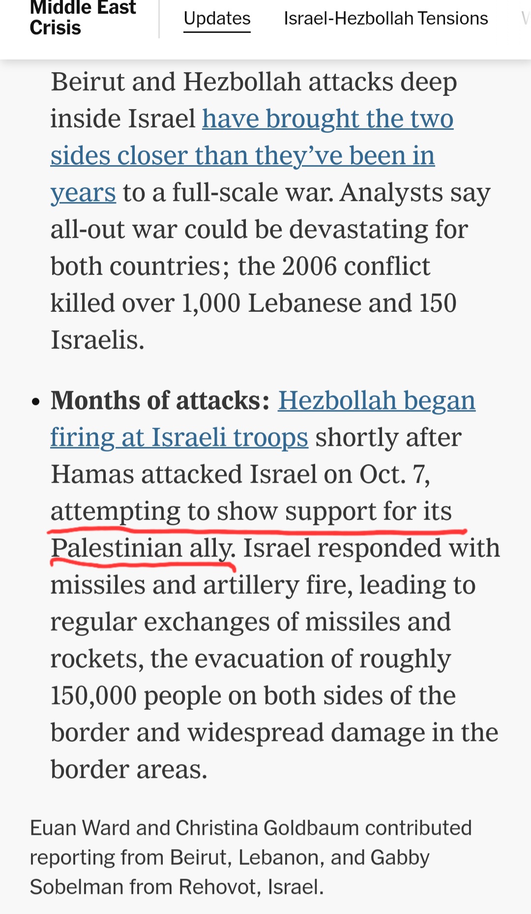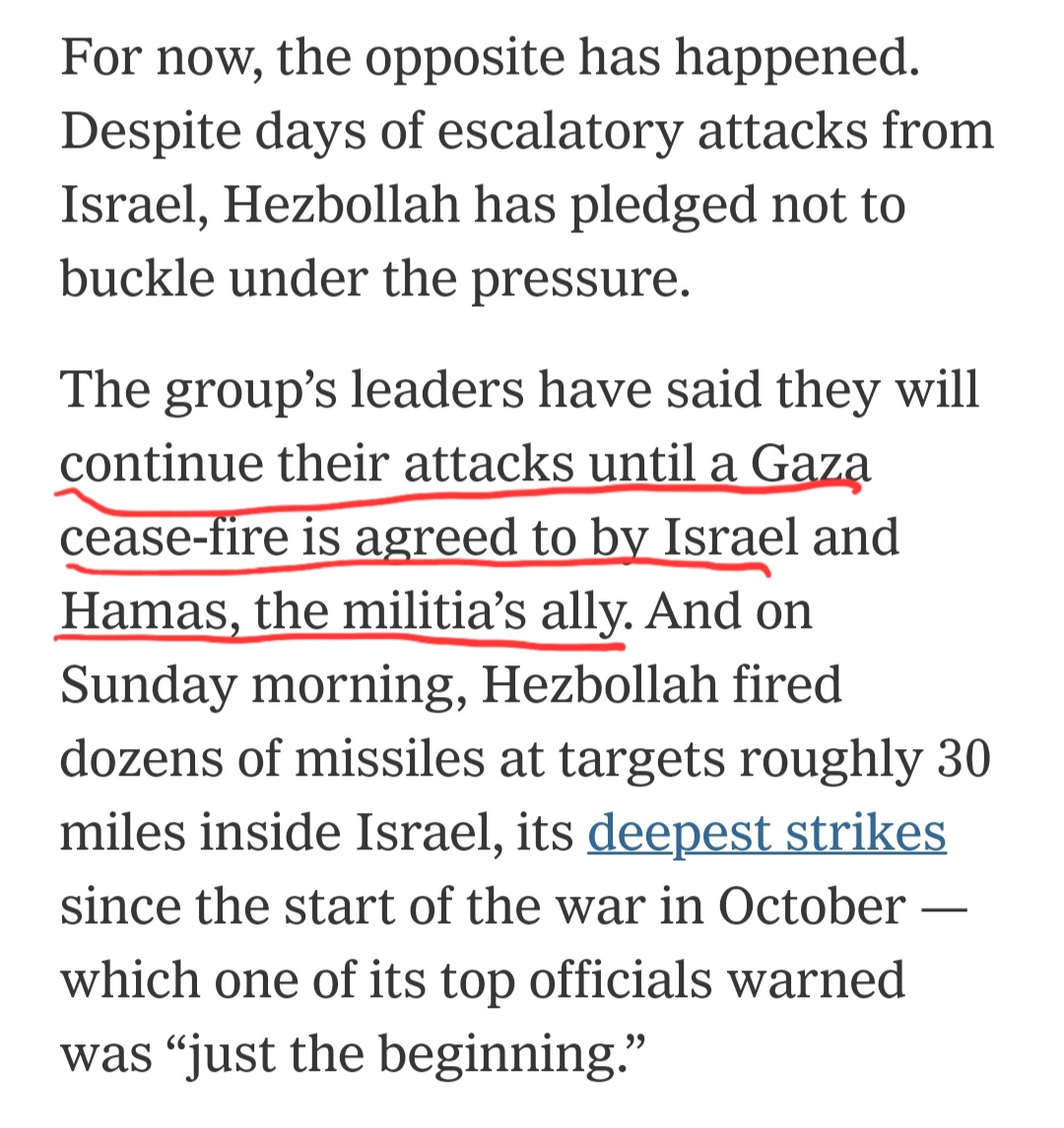 In this telling of the events, Israel has opened up a new front against Hezbollah for virtually no reason, as the key to stopping the Hezbollah attacks is to end the fighting in Gaza. Israel’s “ferocious assault on Hezbollah” is not only unwarranted but infuriating the United States President Biden who has sought to confine the fighting to Gaza.