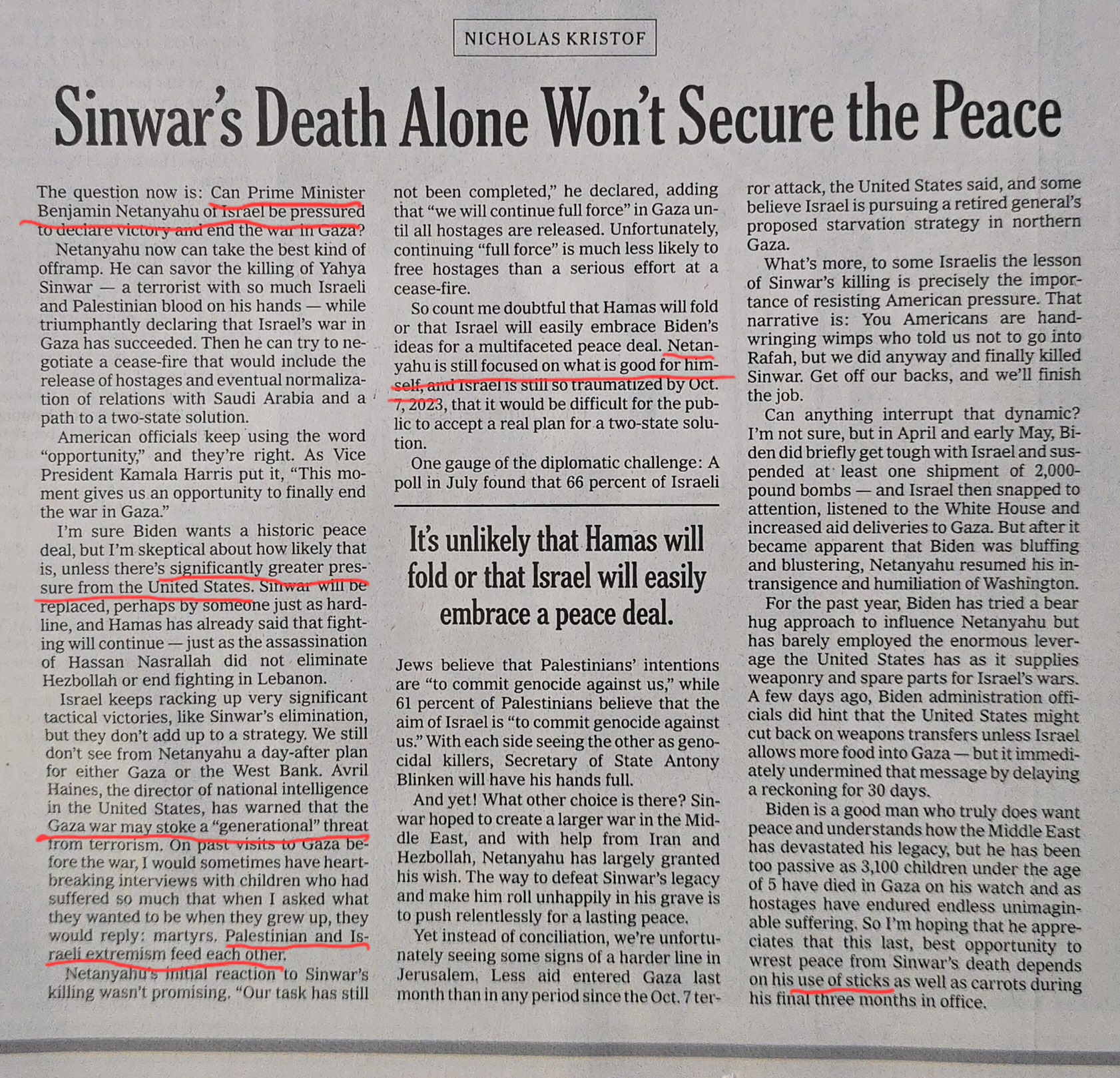 Kristof wrote an opinion in the aftermath of Israel’s killing of Yahya Sinwar, mastermind of the savage October 7 massacre of 1,200 people in Israel. He led with a call for the United States to pressure Netanyahu, and repeated the demand throughout his article.